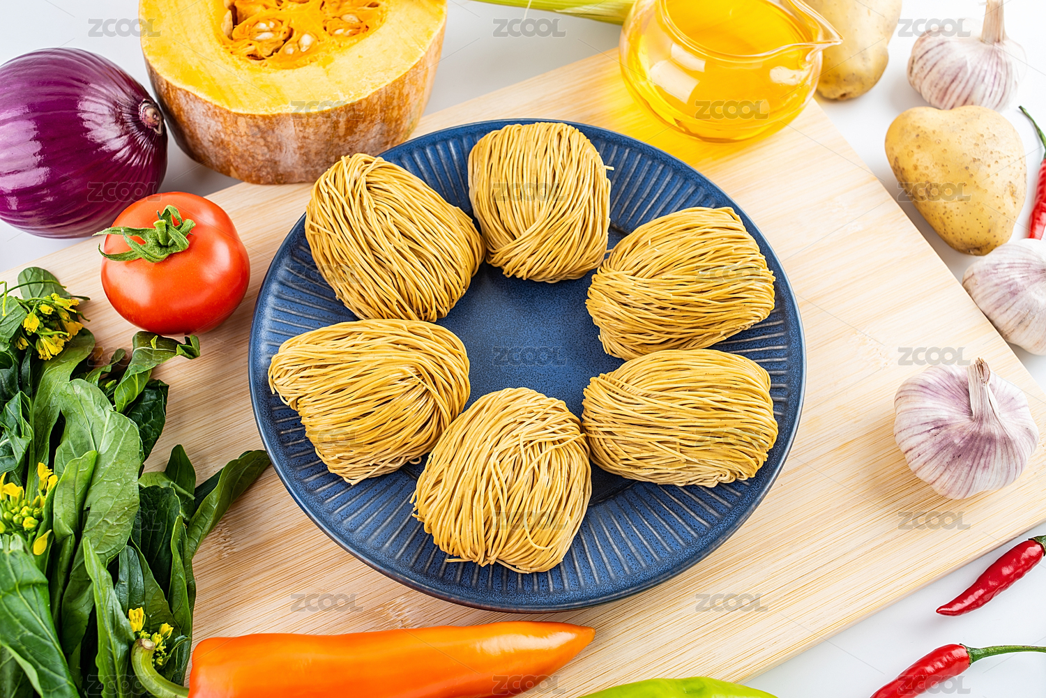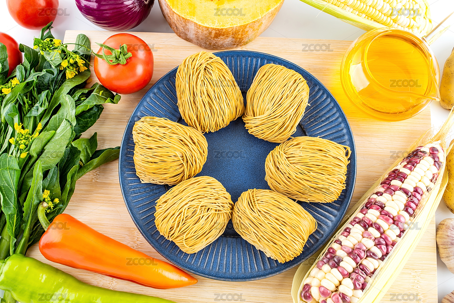新鮮的蔬菜瓜果和瑤柱面條/營(yíng)養(yǎng)學(xué)概念背景素材