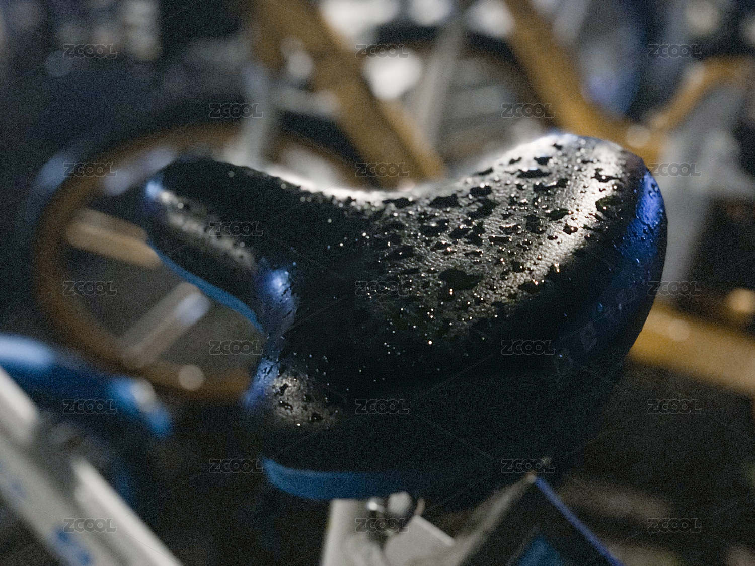 下雨天路邊共享單車座椅局部特寫