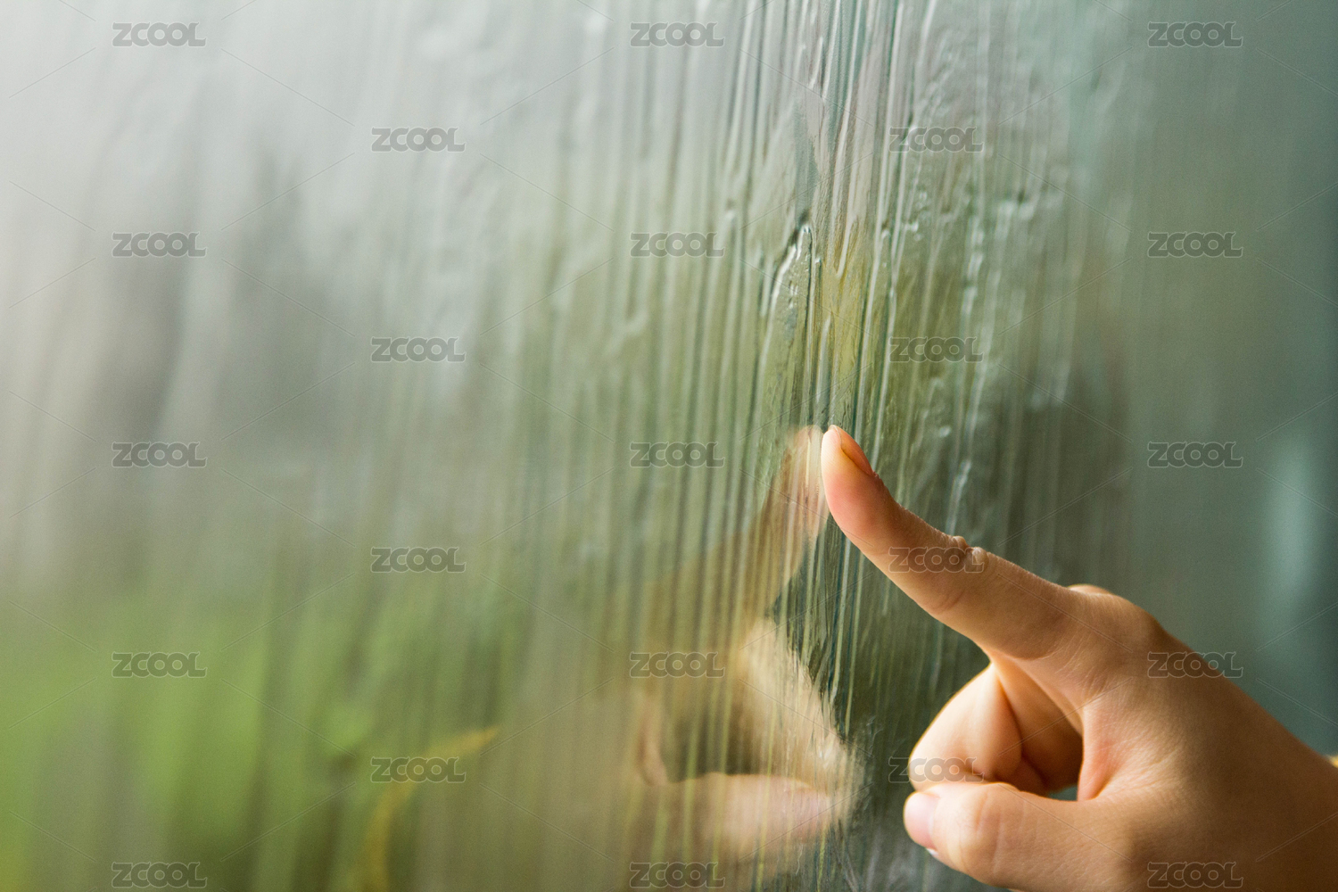 手觸摸帶雨滴的玻璃
