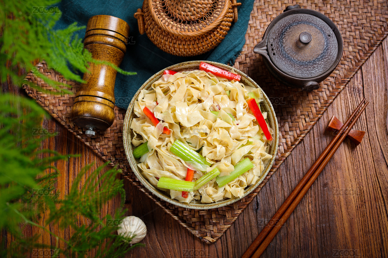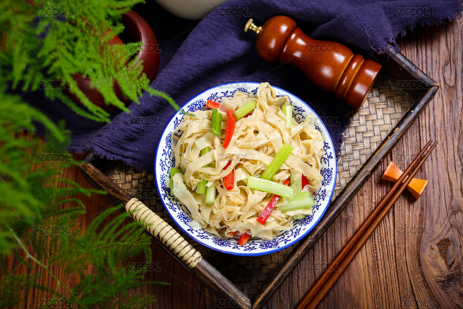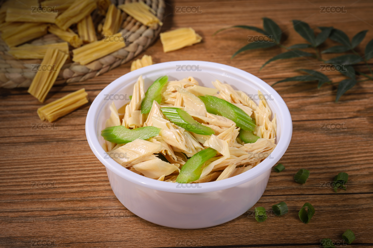 木紋背景上碗里的芹菜腐竹