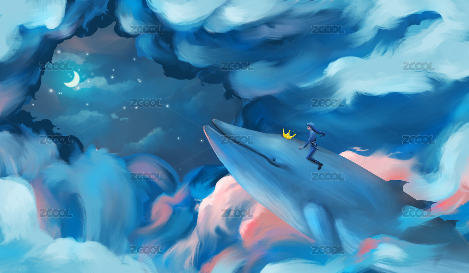 女孩騎著鯨魚在云端翱翔
