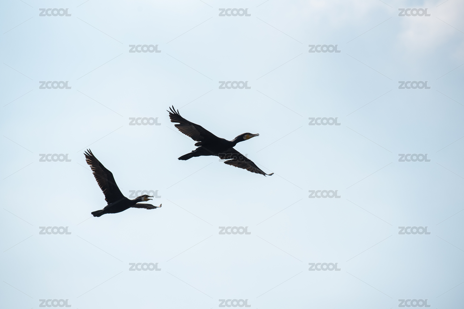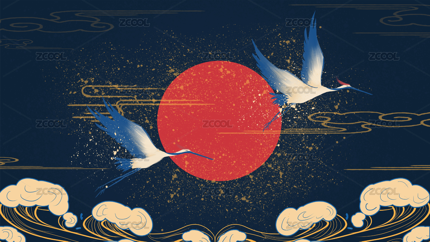 藍(lán)色大海上翱翔的兩只仙鶴中國風(fēng)插畫