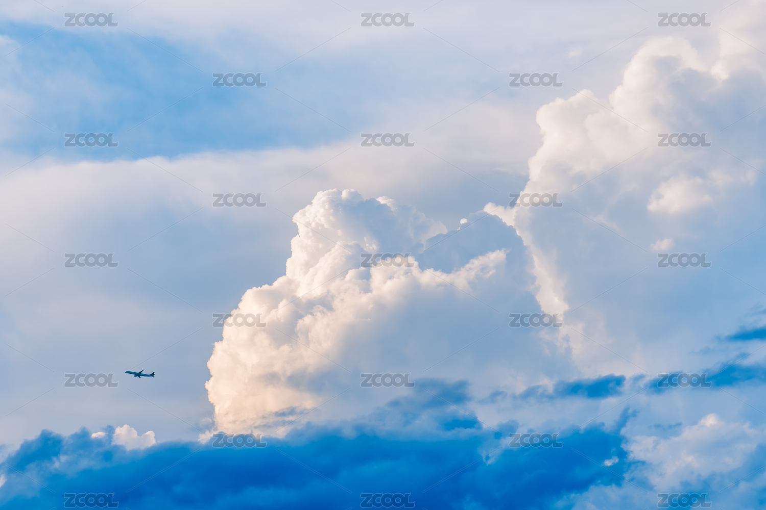 藍(lán)色天空和云層中一架翱翔的飛機(jī)