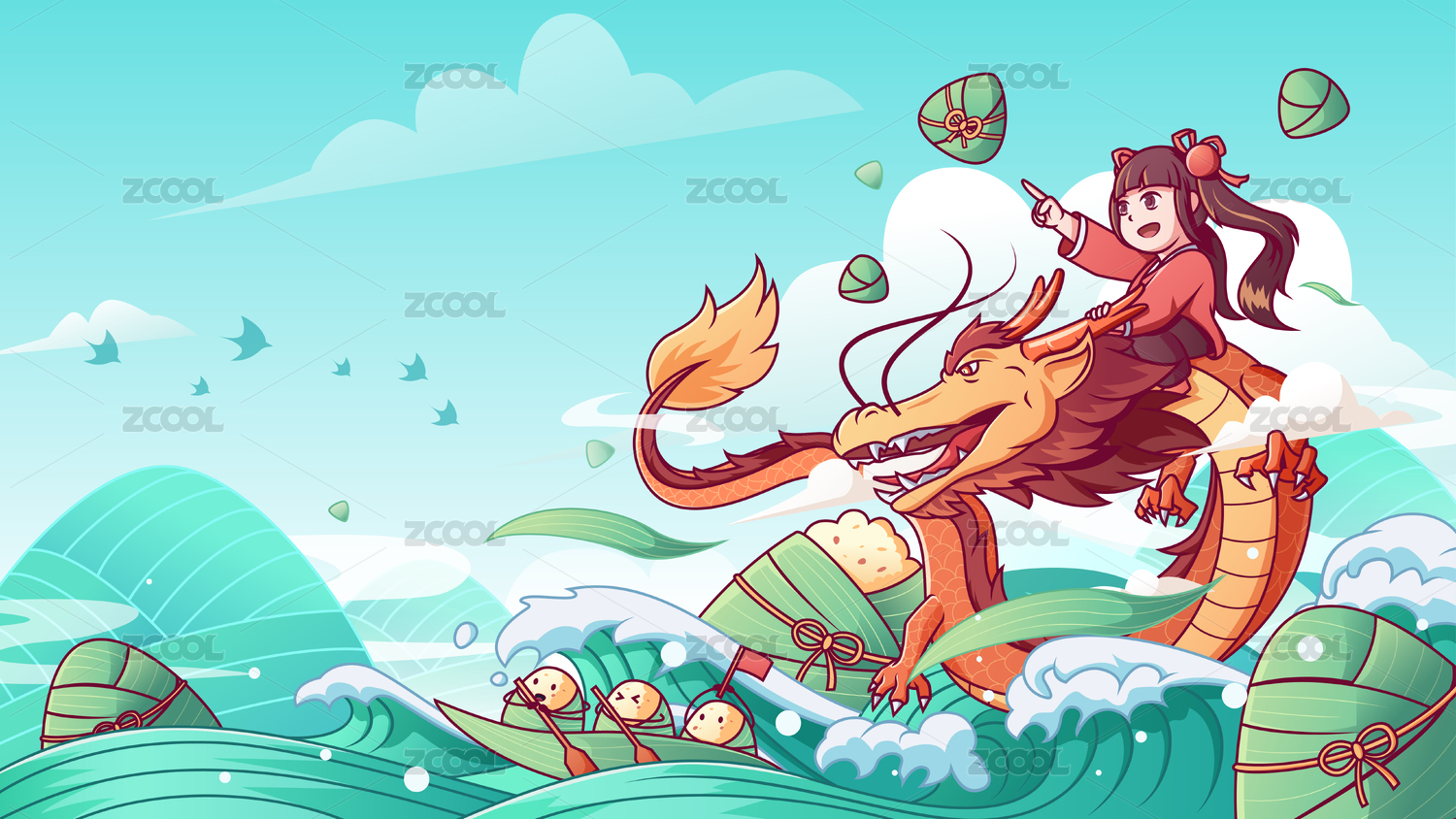 女生騎著龍翱翔大海旁邊有很多粽子矢量插畫