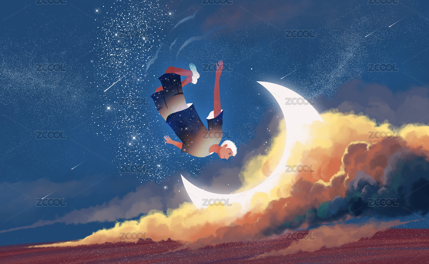 在星空自由翱翔的人插畫