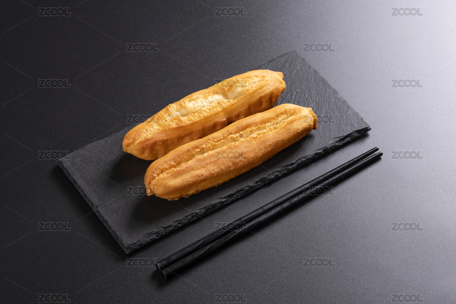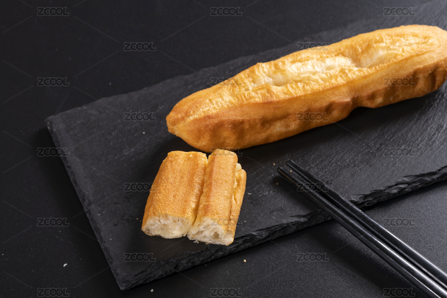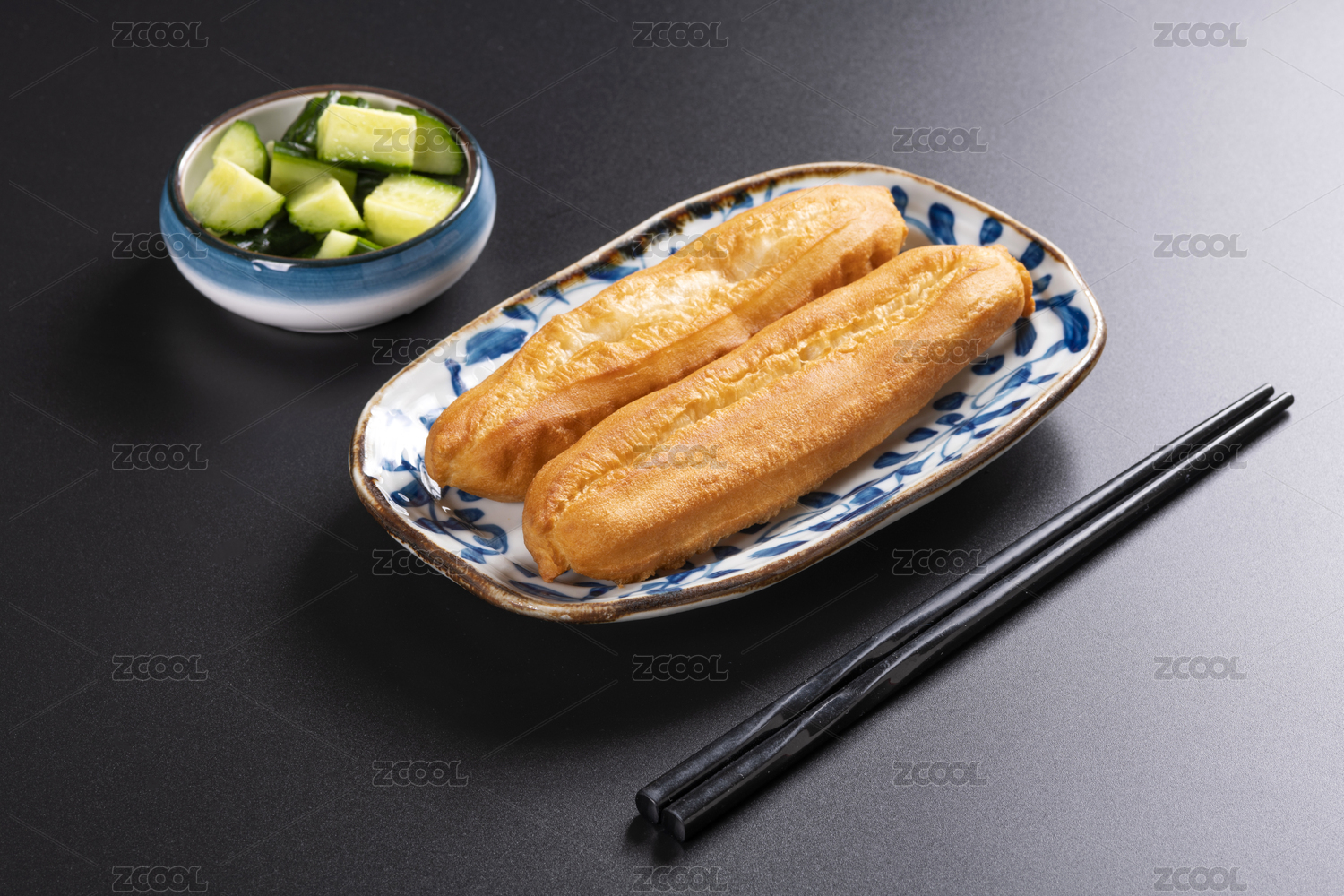 剛炸熟的油條擺放在盤子中旁邊配有筷子和拌黃瓜