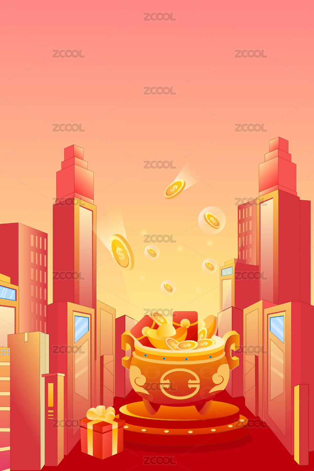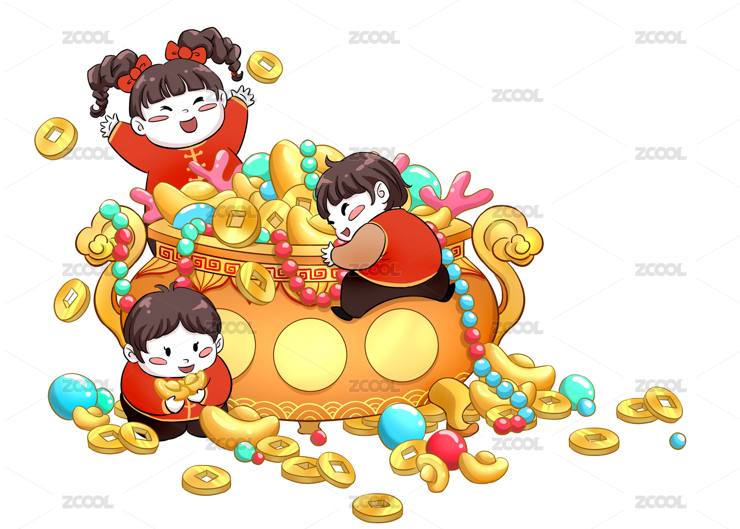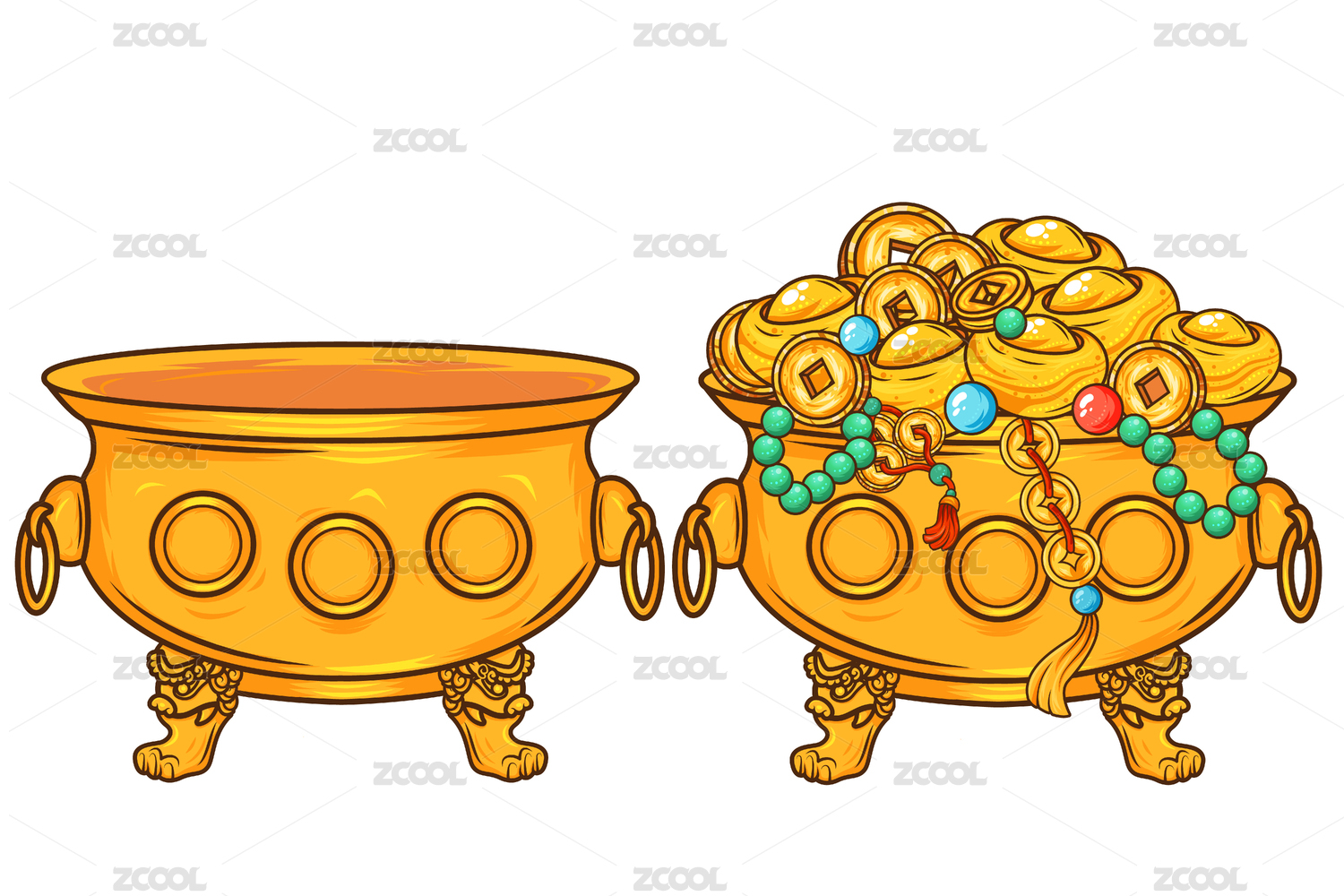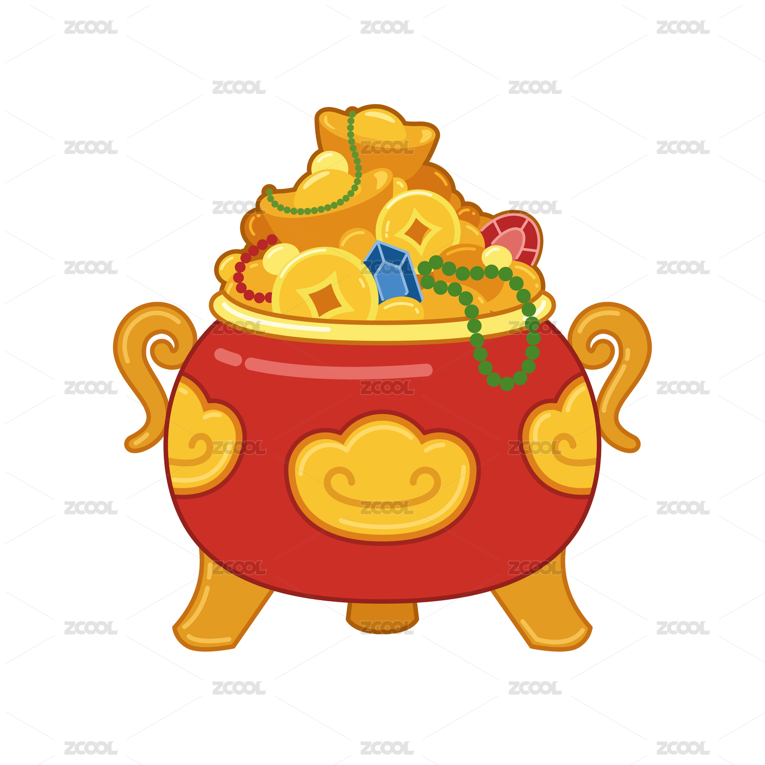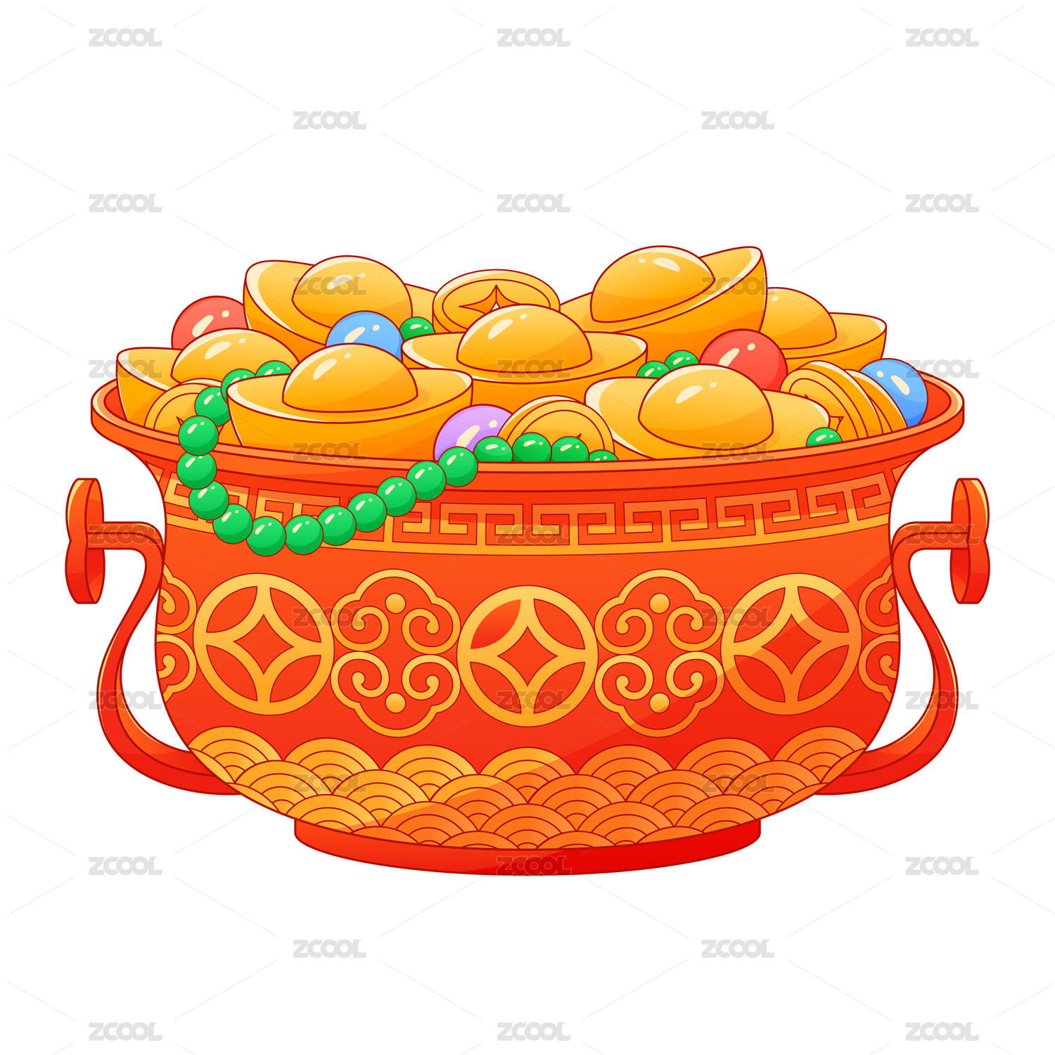 國(guó)潮矢量中國(guó)風(fēng)裝滿(mǎn)元寶金幣珍珠瑪瑙聚寶盆