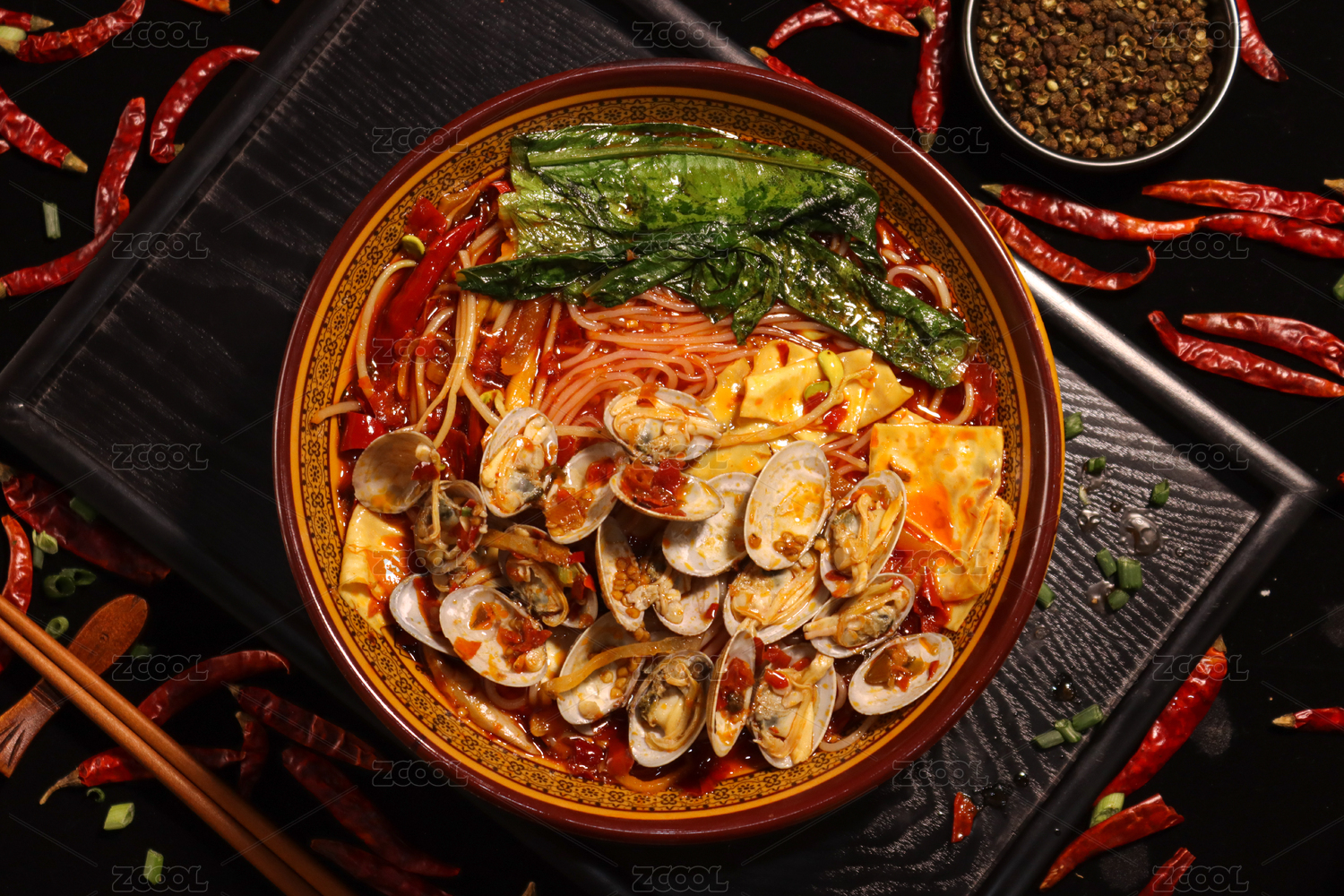 黑底上放著一碗花甲米線砂鍋和筷子夾著花甲