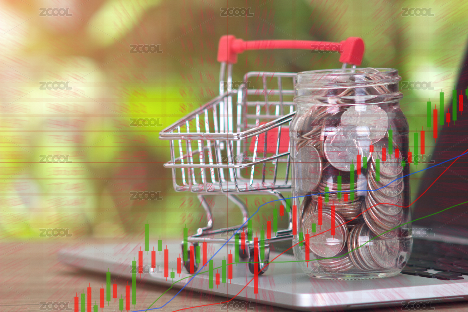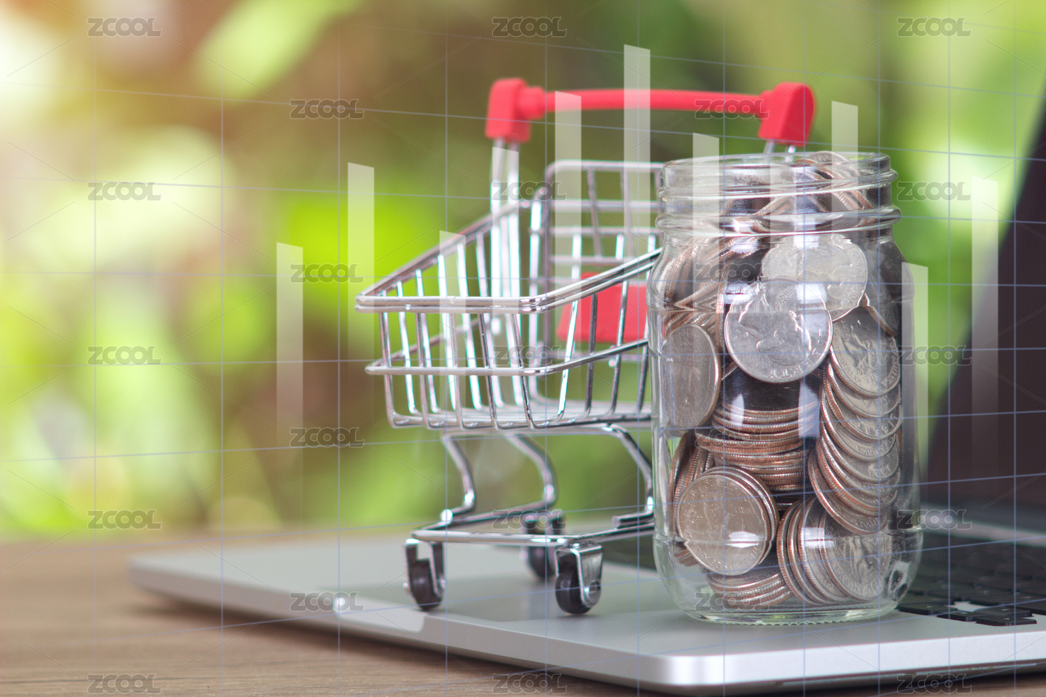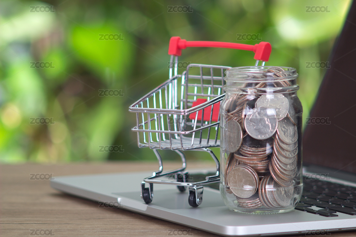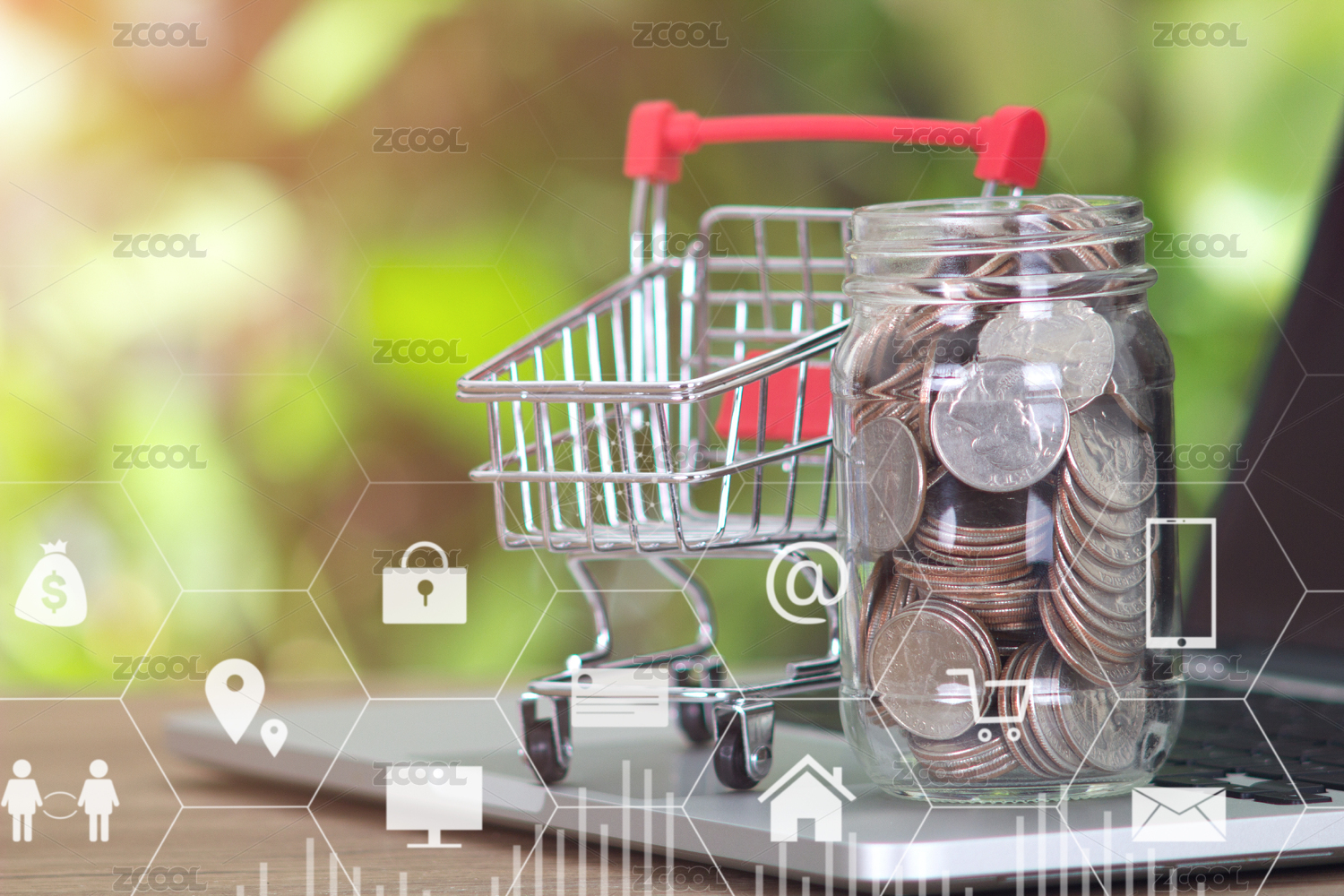 筆記本電腦鍵盤上一個裝滿美元的玻璃瓶和一輛空的購物車