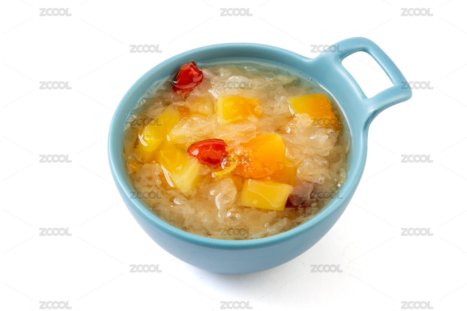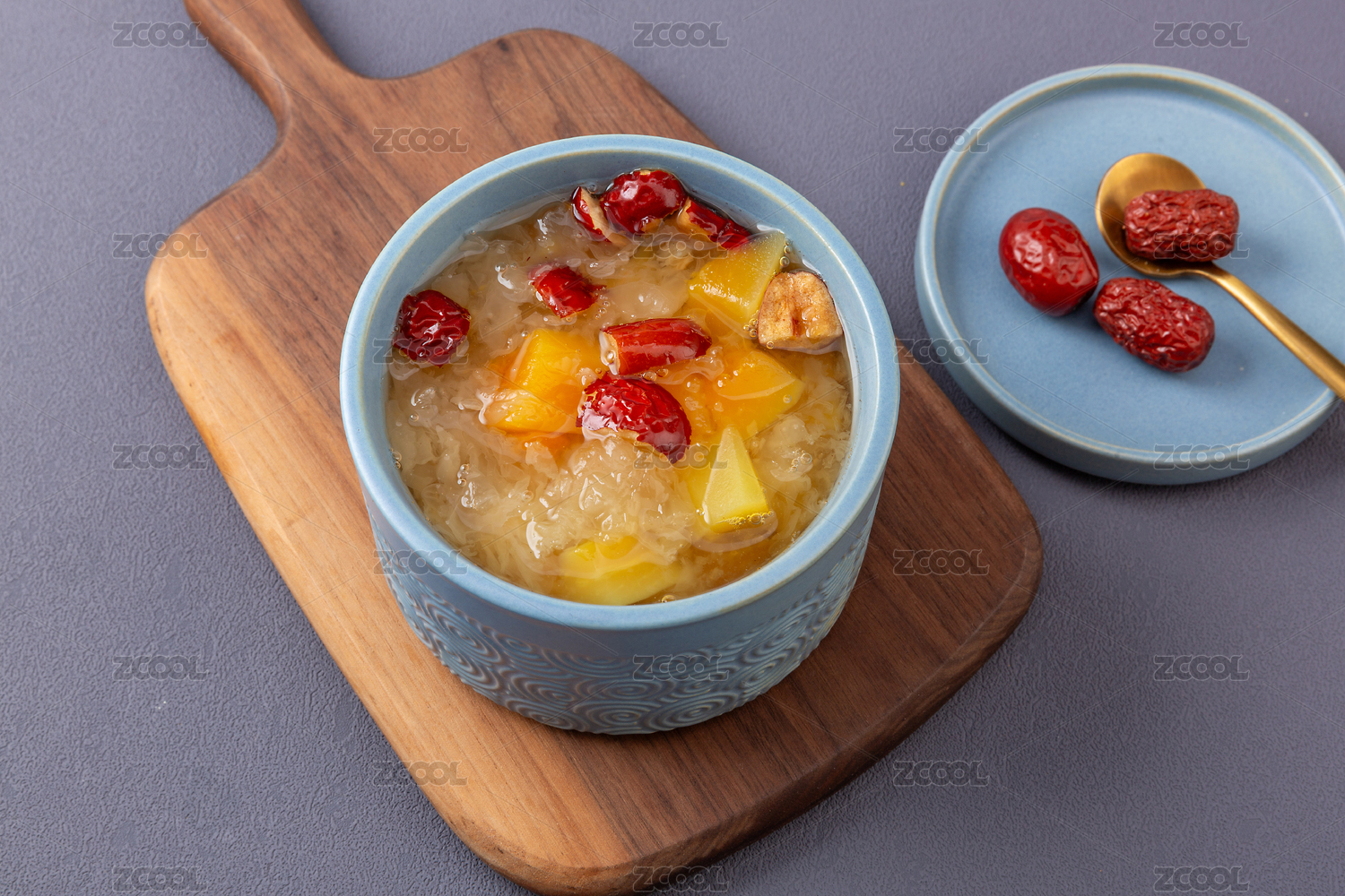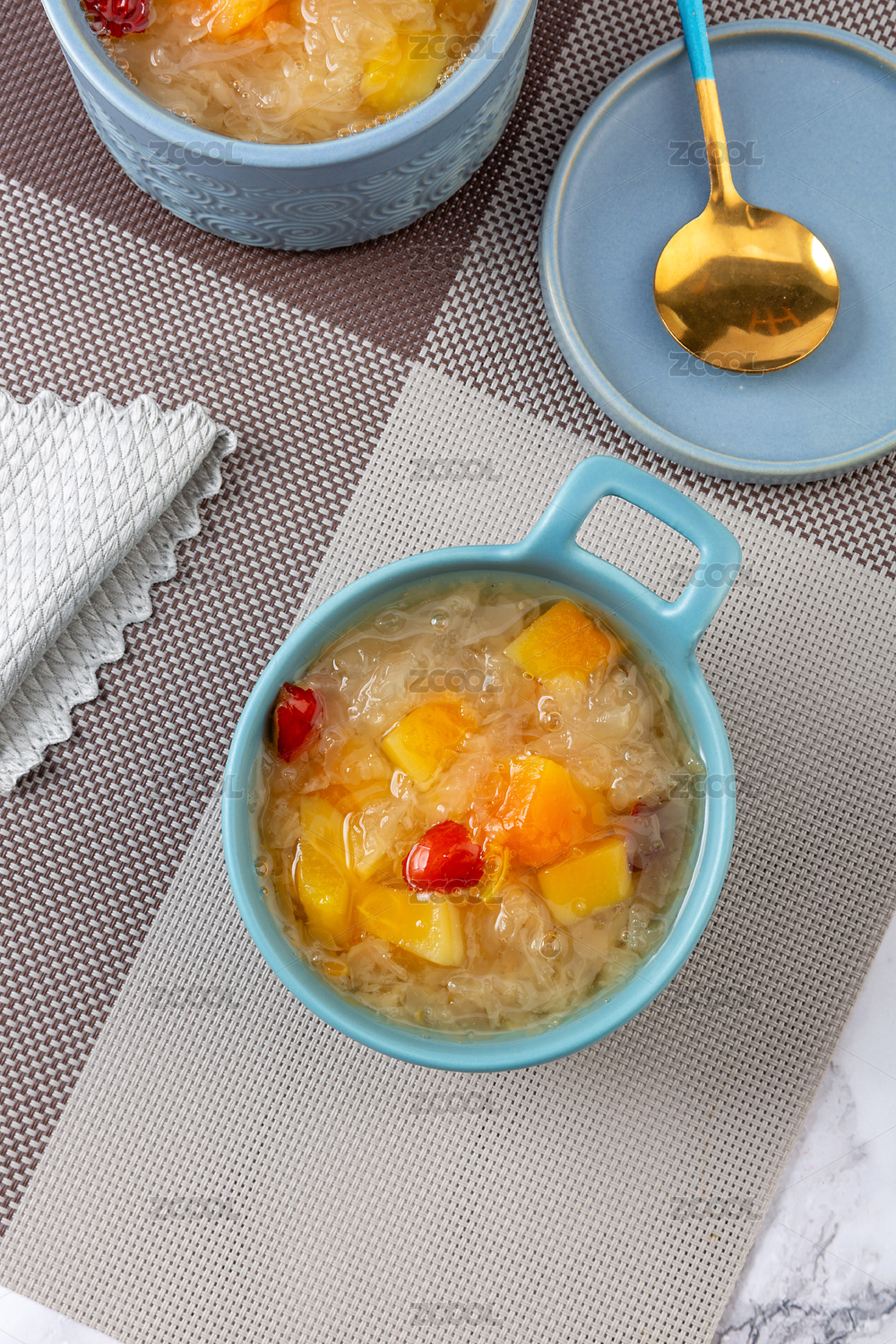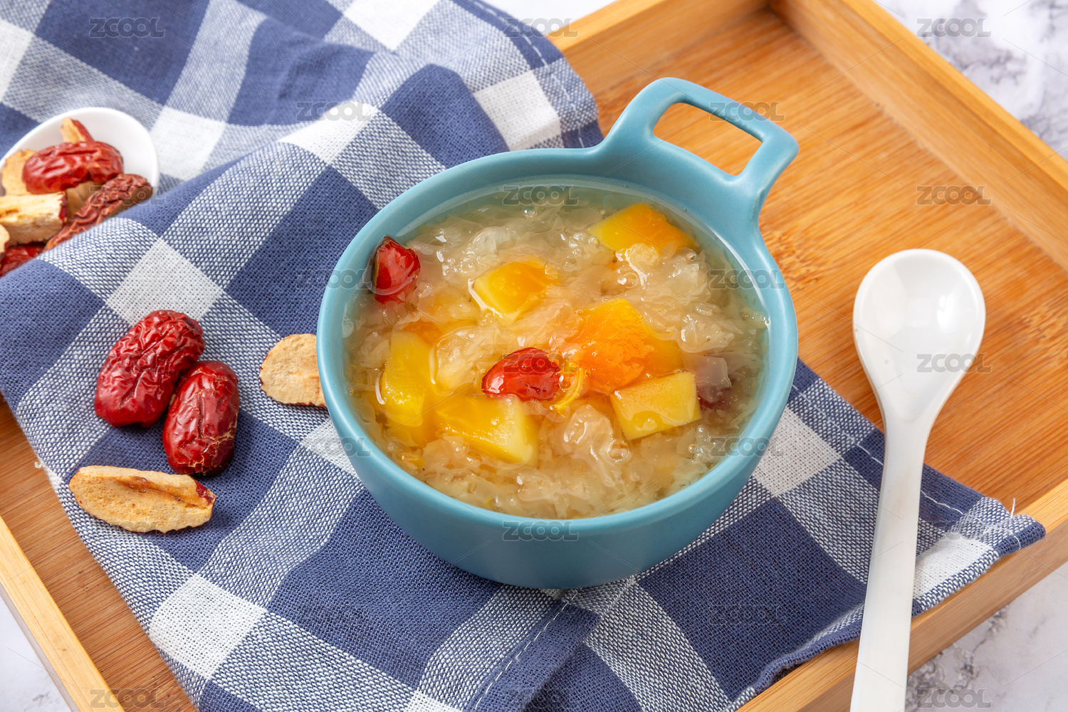 中式場景中裝在碗里的木瓜銀耳羹
