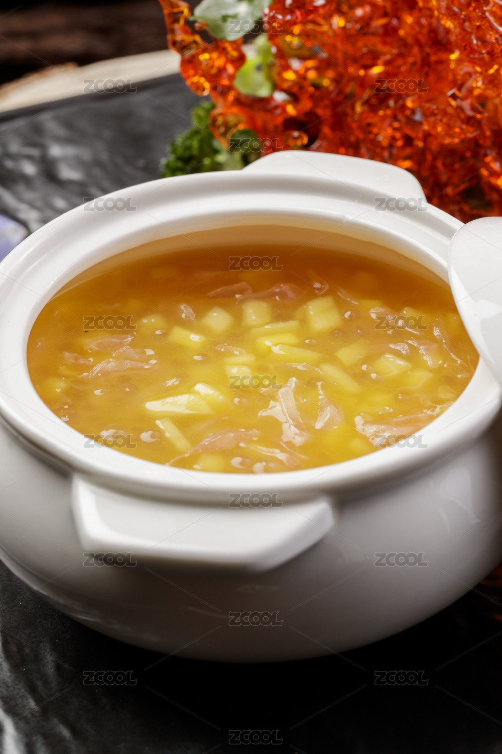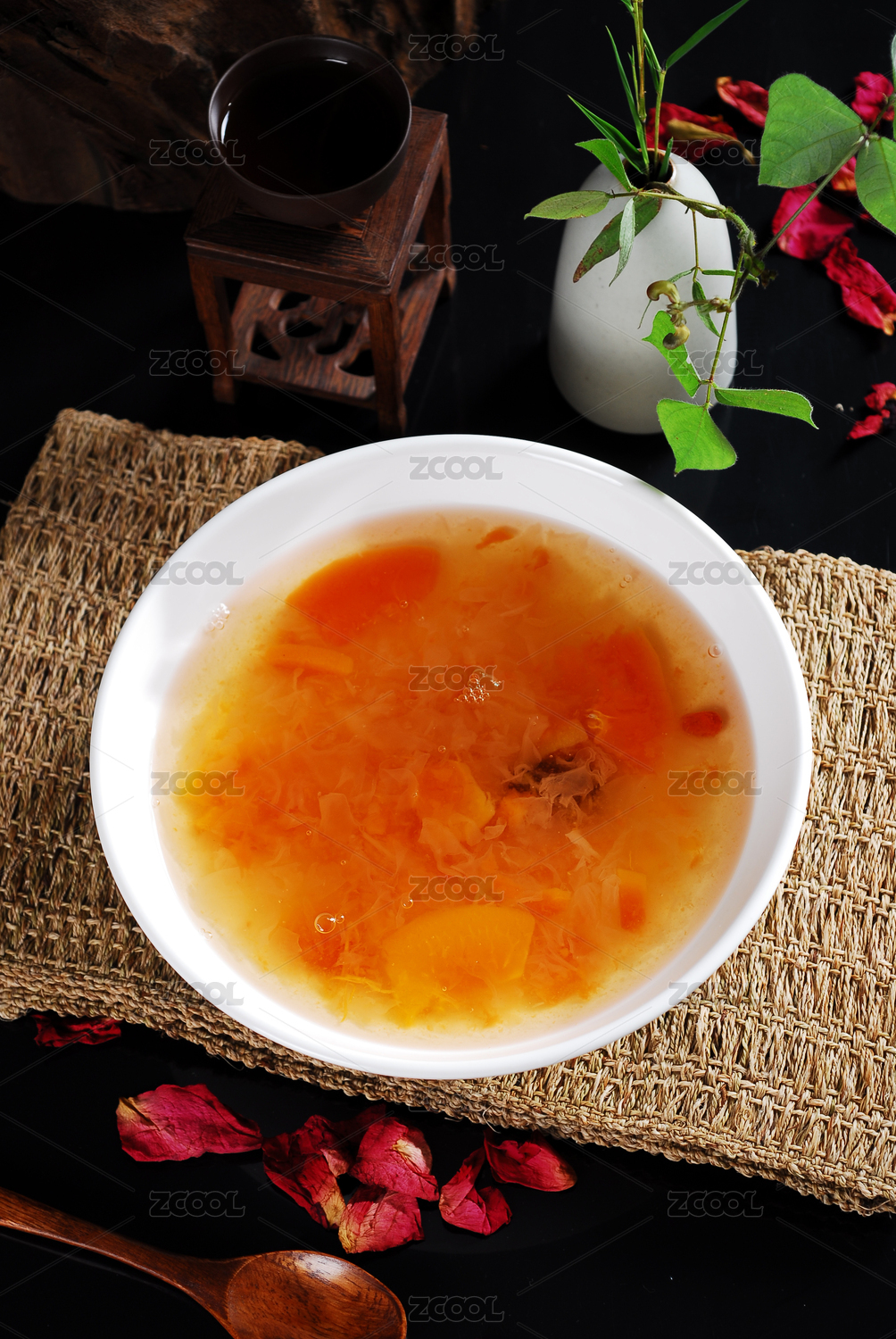 白色湯盅裝的木瓜銀耳羹擺放在黑色石盤上