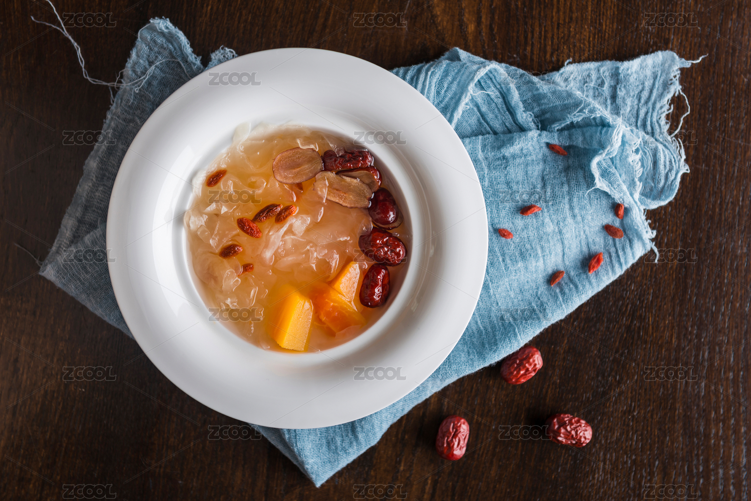 中式場景中裝在木碗里的木瓜銀耳羹俯拍