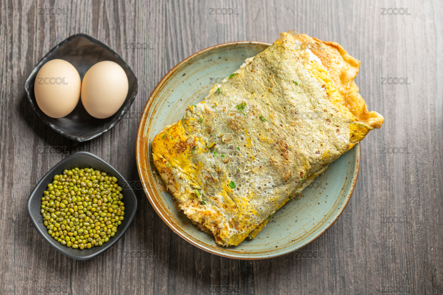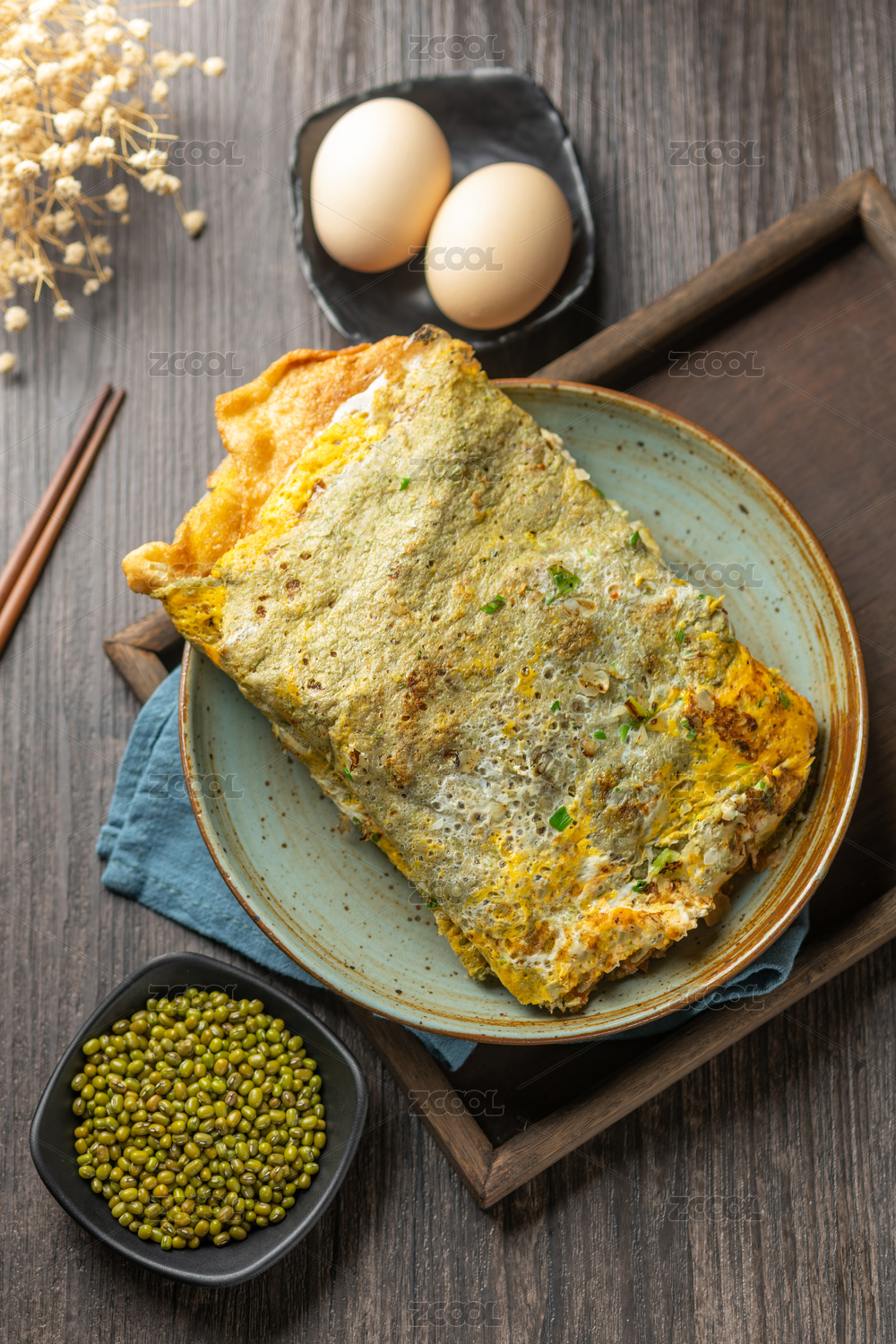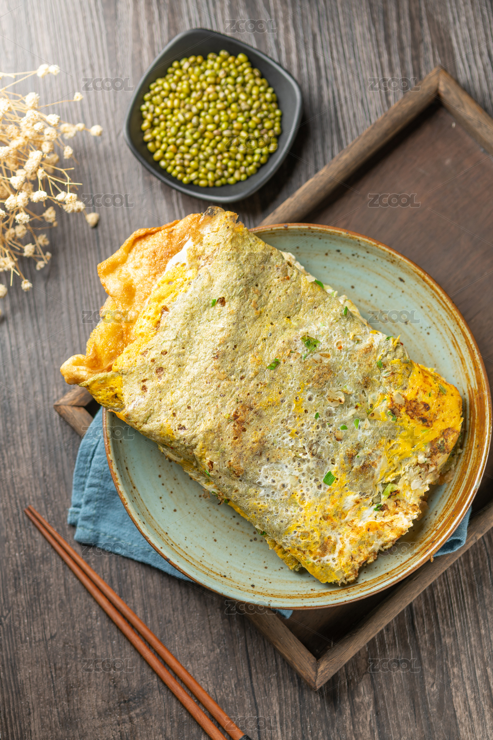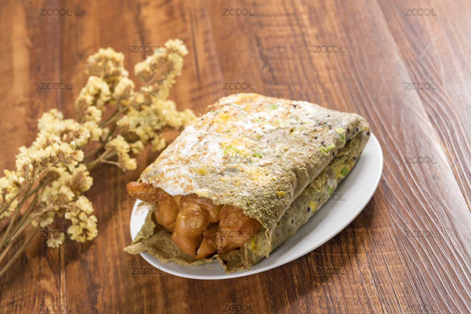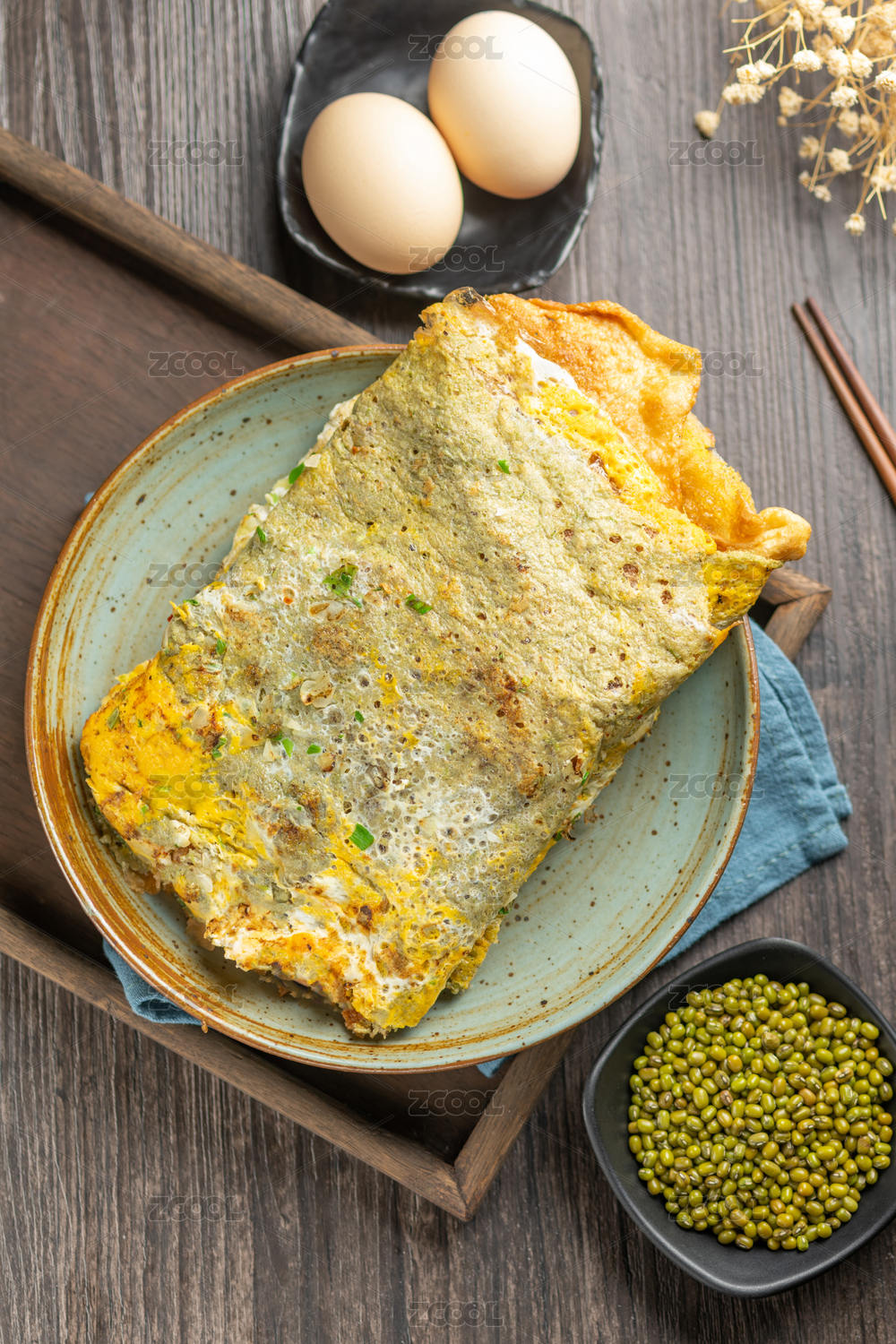 天津傳統(tǒng)小吃由綠豆面雞蛋油條制成的煎餅果子
