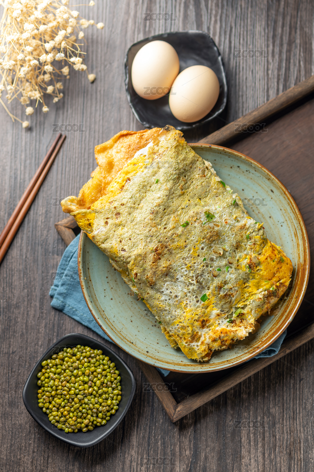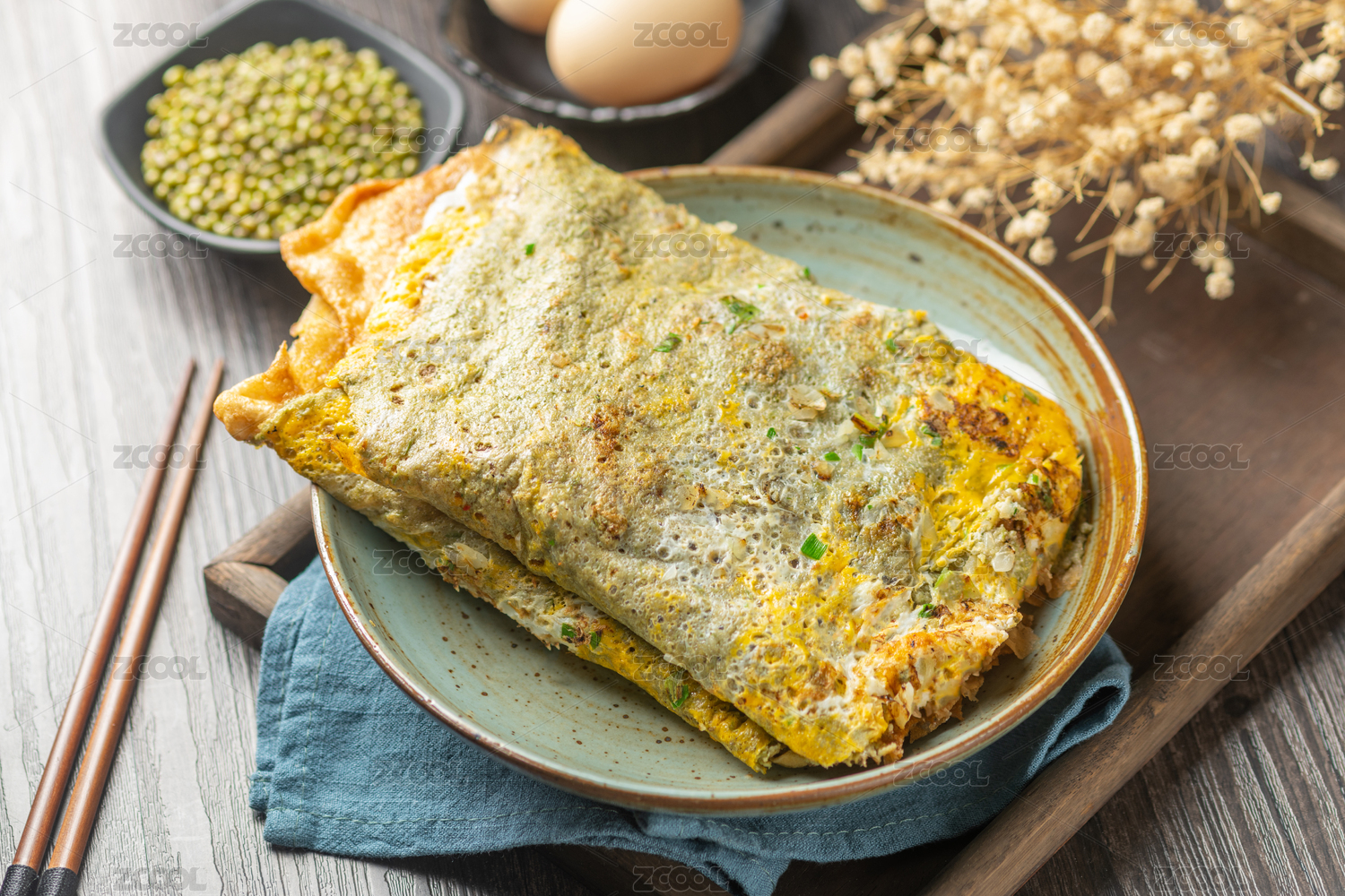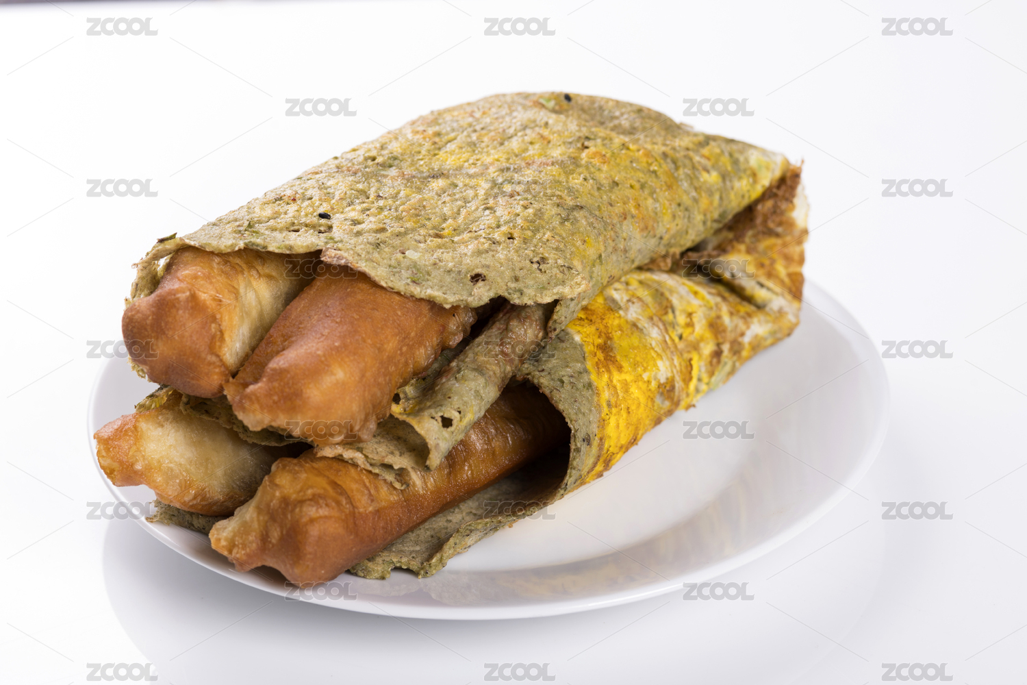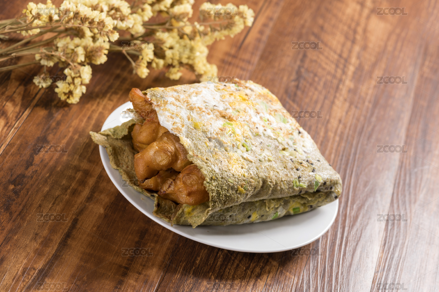 天津傳統(tǒng)小吃煎餅果子,綠豆面煎餅裹著剛炸成的油條