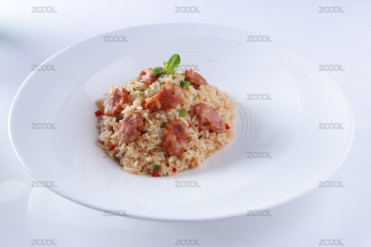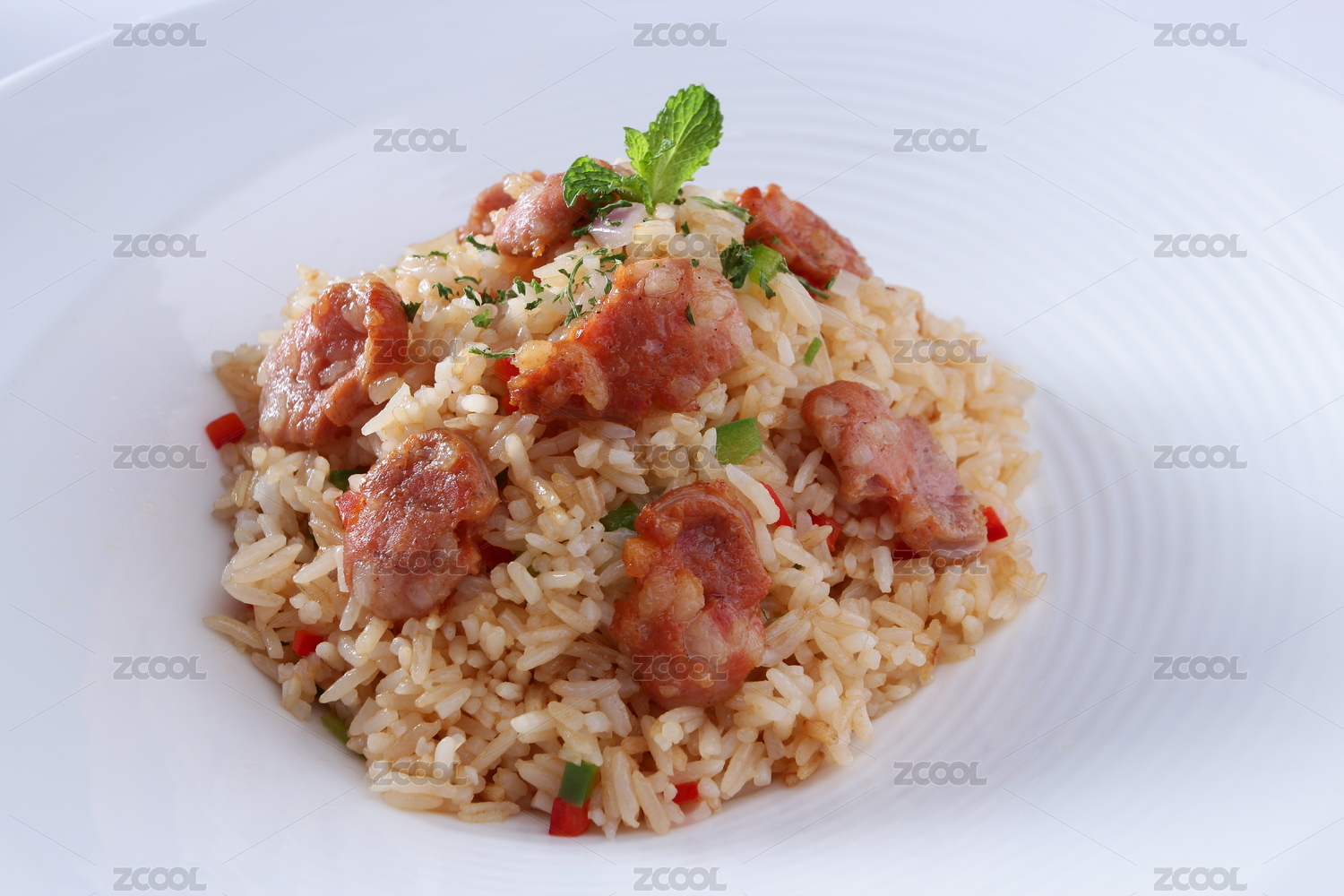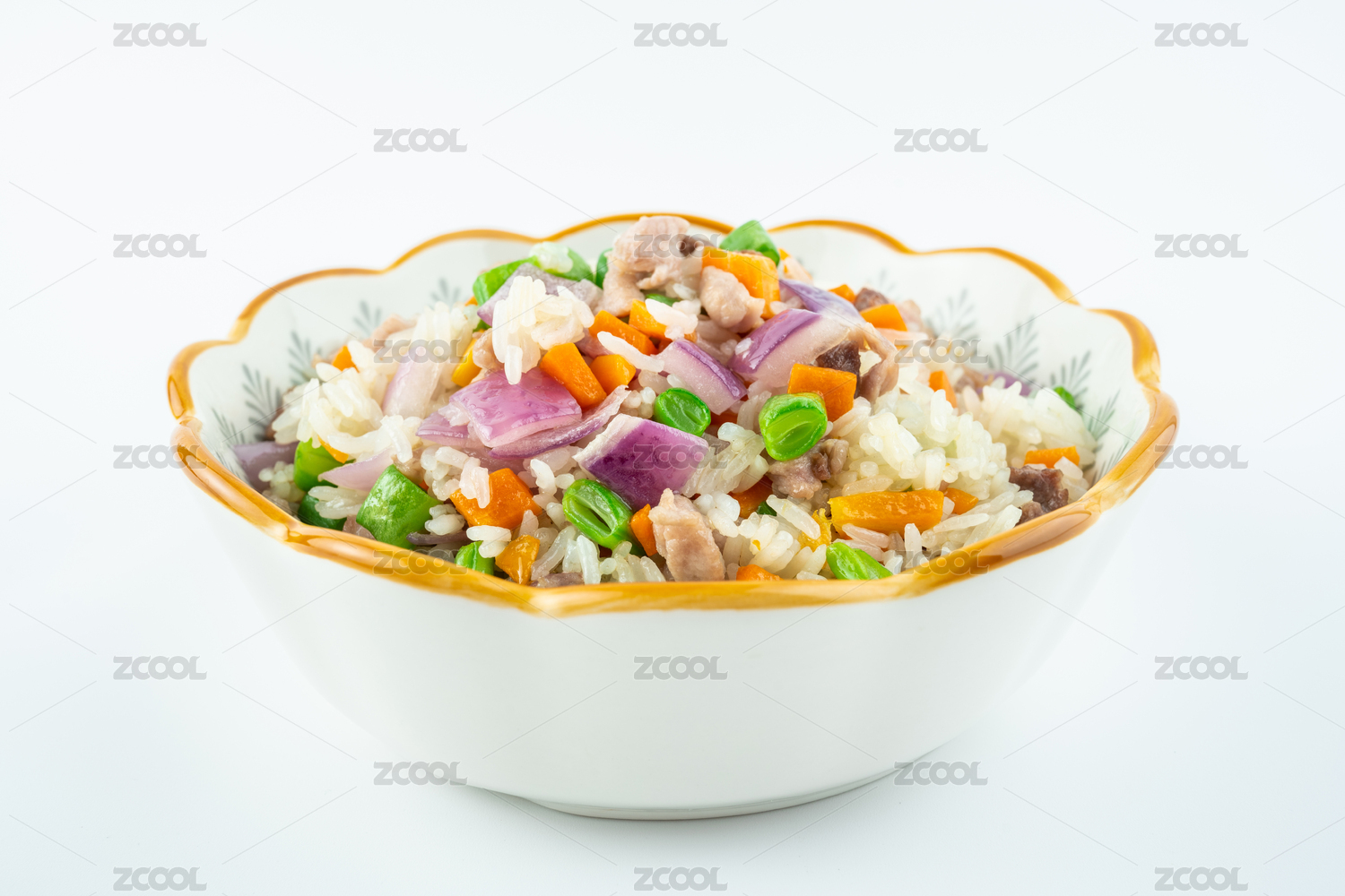 白背景上一碟家常五彩肉炒飯