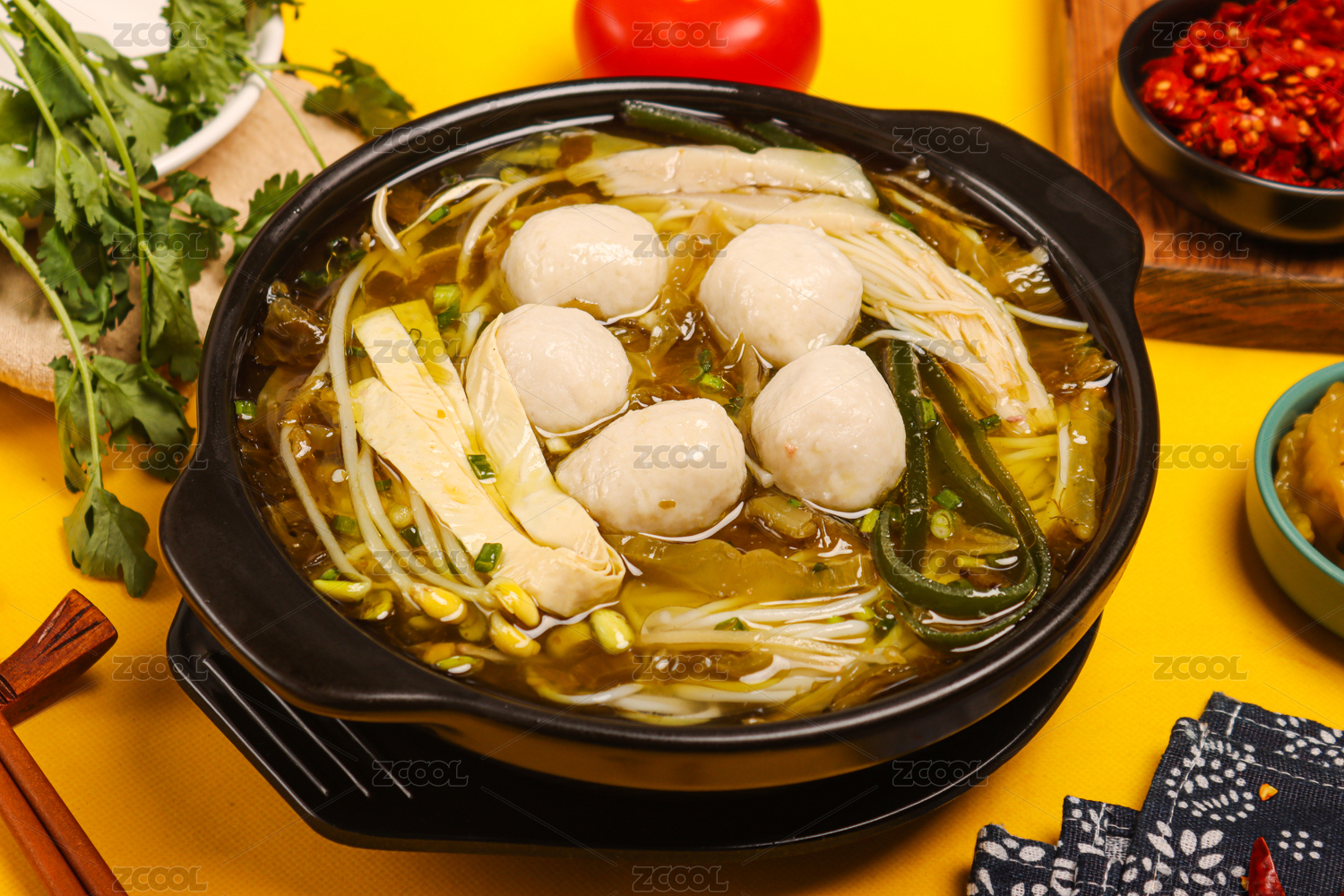 黑色大碗里的泡椒酸菜魚丸魚片米粉米線