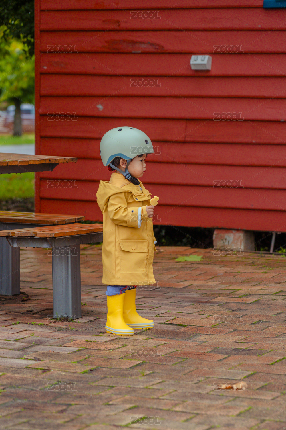 紅色小木屋前的穿黃色雨衣的小男孩