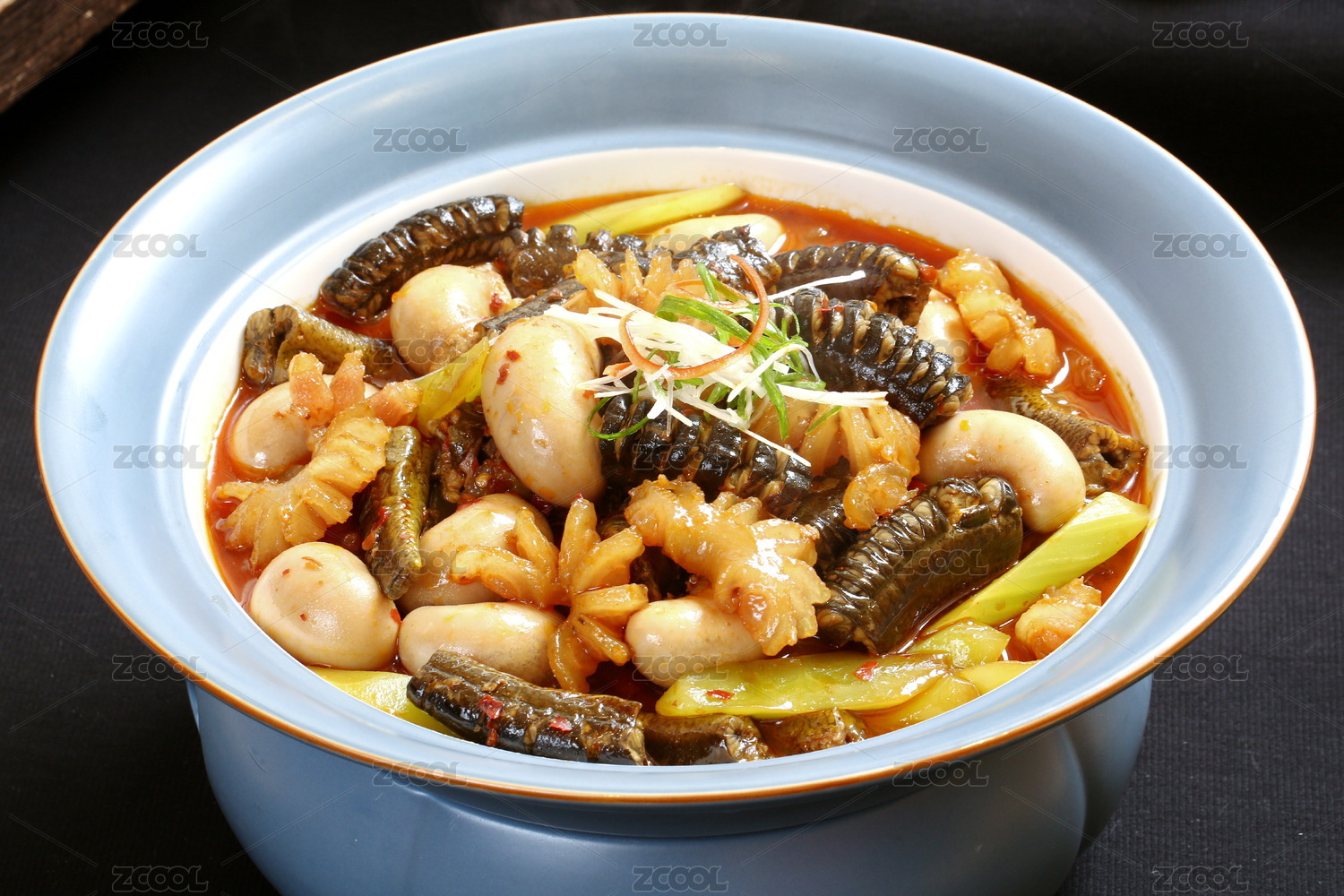 黑底上放著一鍋養(yǎng)生雞腰湯和勺子上挖著雞腰