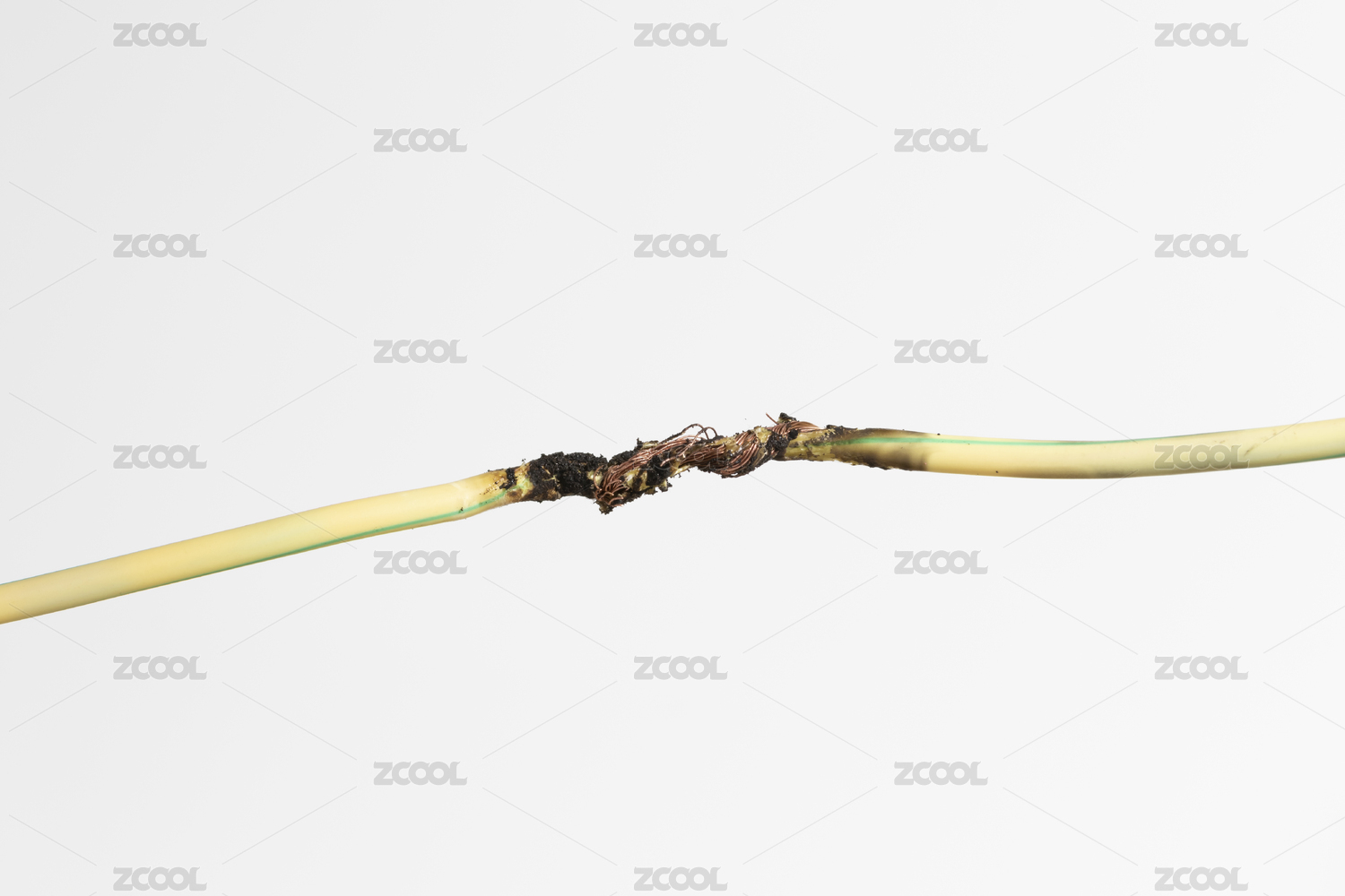 白色背景下一根燃燒過(guò)糊掉的黃色電線