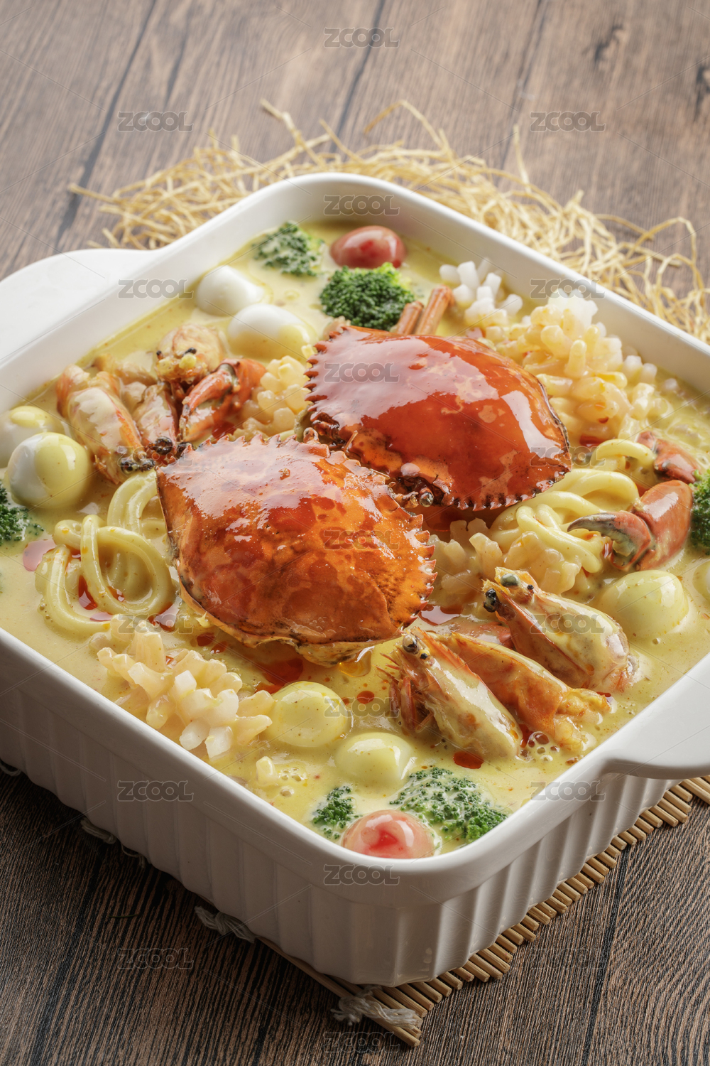 方瓷盆裝的什錦芝士海鮮烏冬面