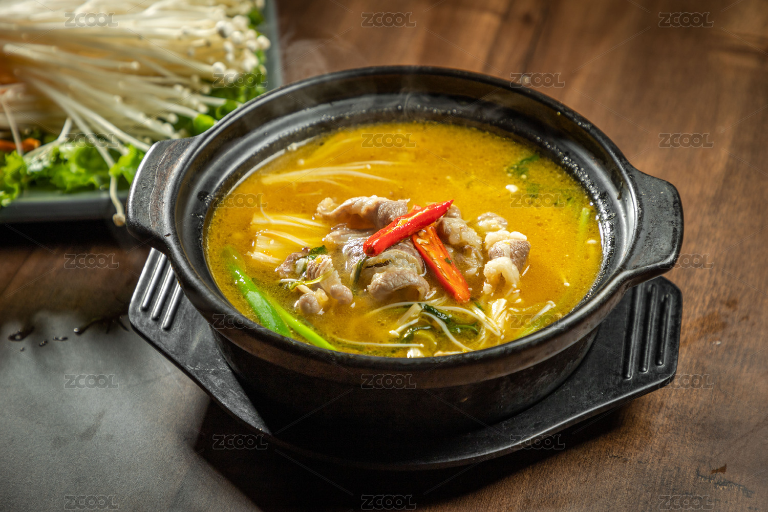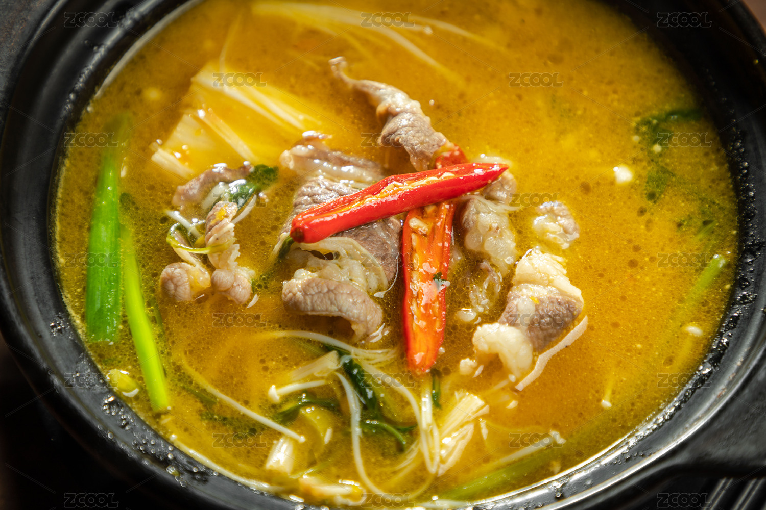 棕色木紋桌上放著一碗酸湯肥牛砂鍋