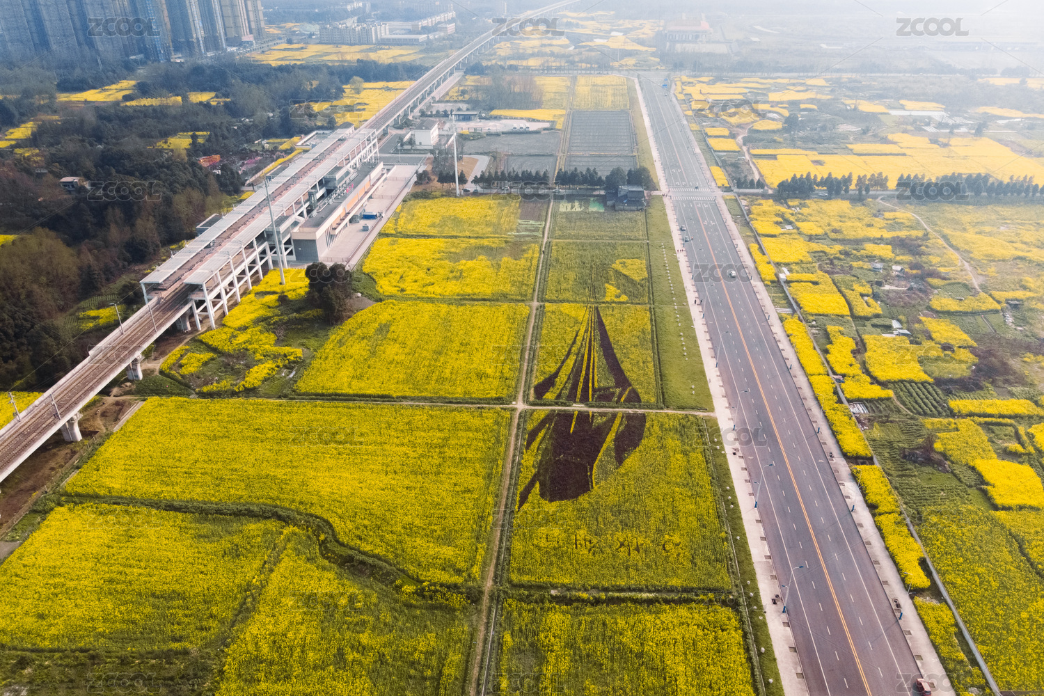 動車高鐵車站油菜花盛開