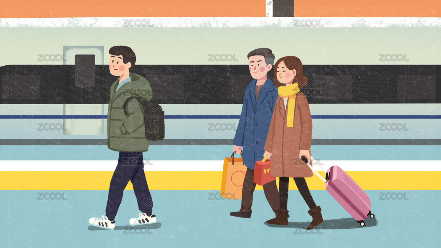 春節(jié)回家過年在高鐵車站趕車的一家四口矢量