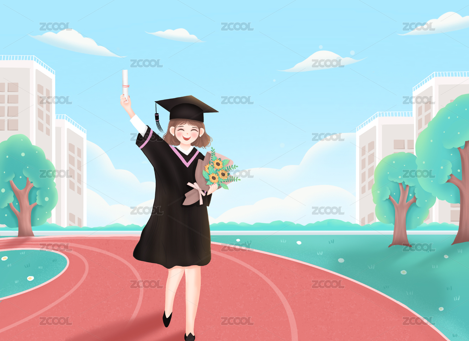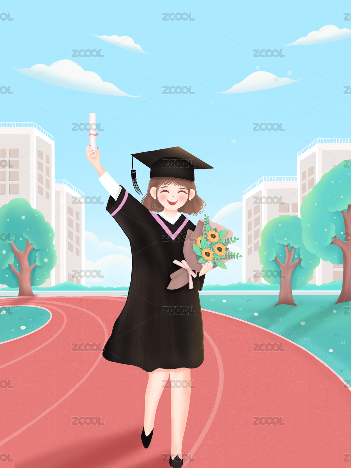 畢業(yè)季拿著鮮花和證書在跑道奔跑的女生