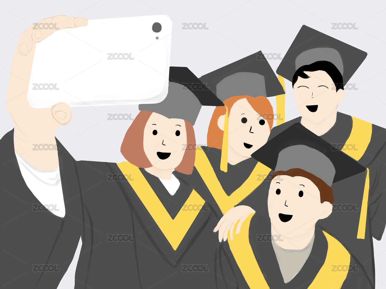 一群帶著穿著學(xué)士服的大學(xué)畢業(yè)生拿著手機(jī)自拍畢業(yè)照手繪插畫