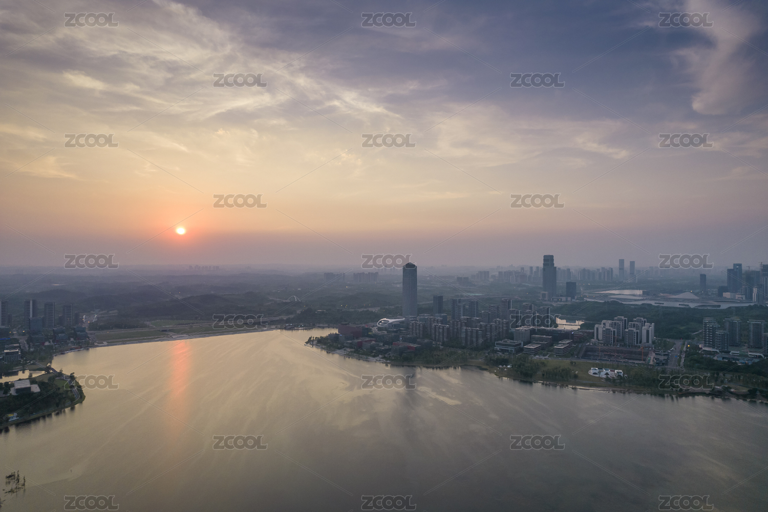 成都天府新區(qū)興隆湖濕地公園科學(xué)城日出航拍