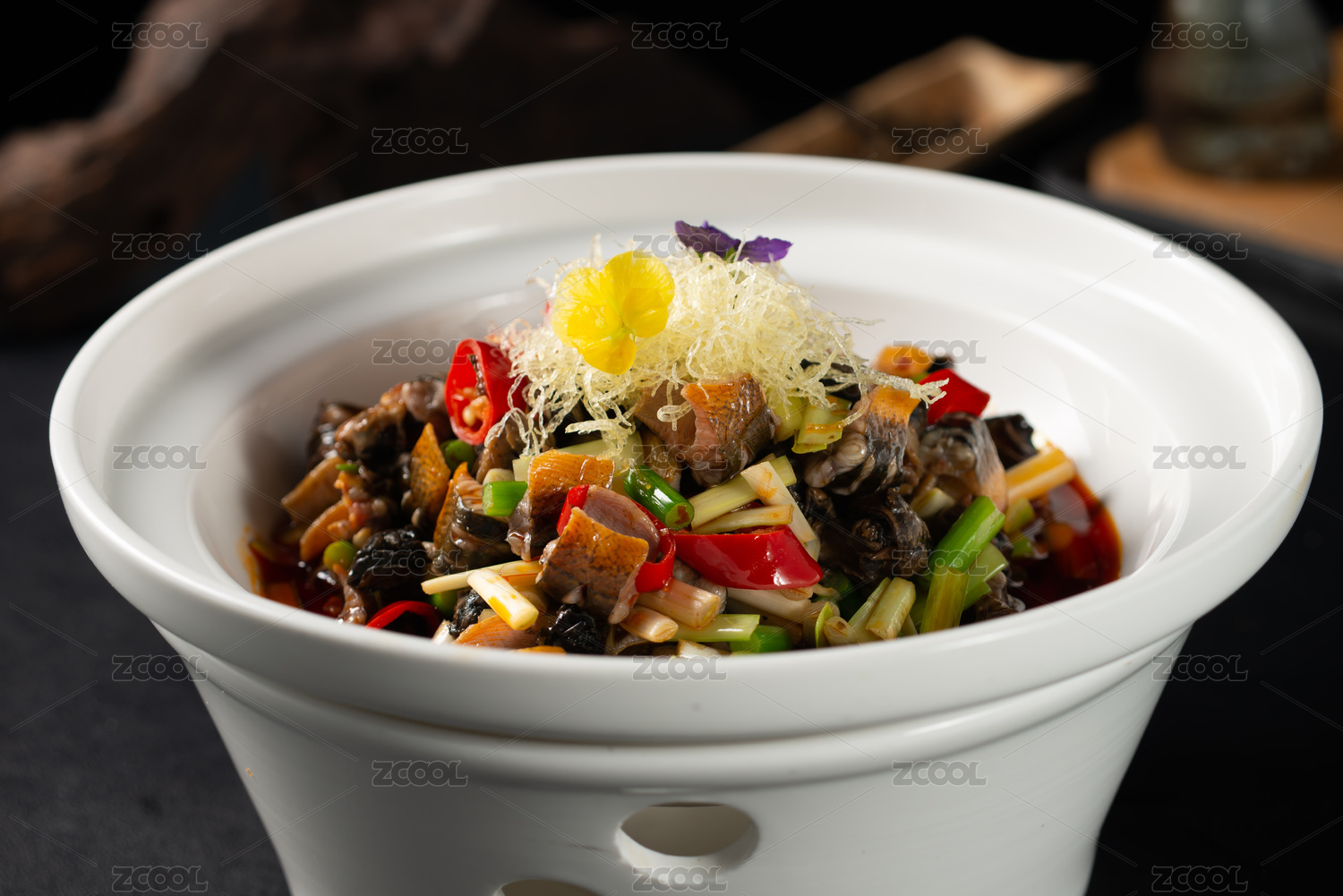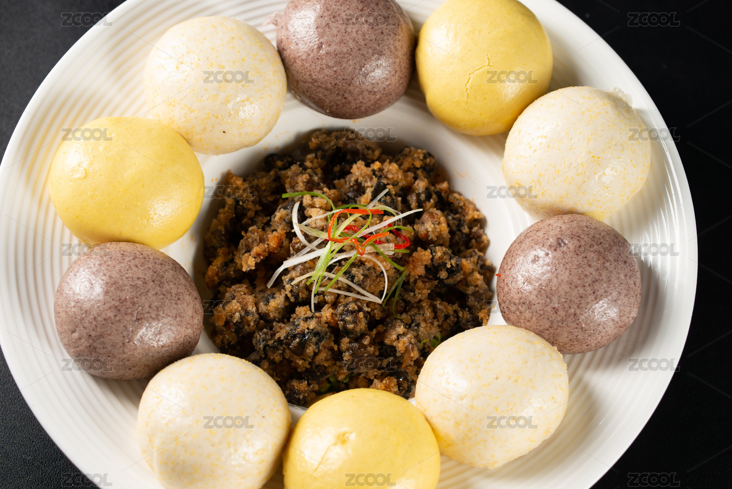 放在黑色背景上碟子里的麻辣螺絲肉末