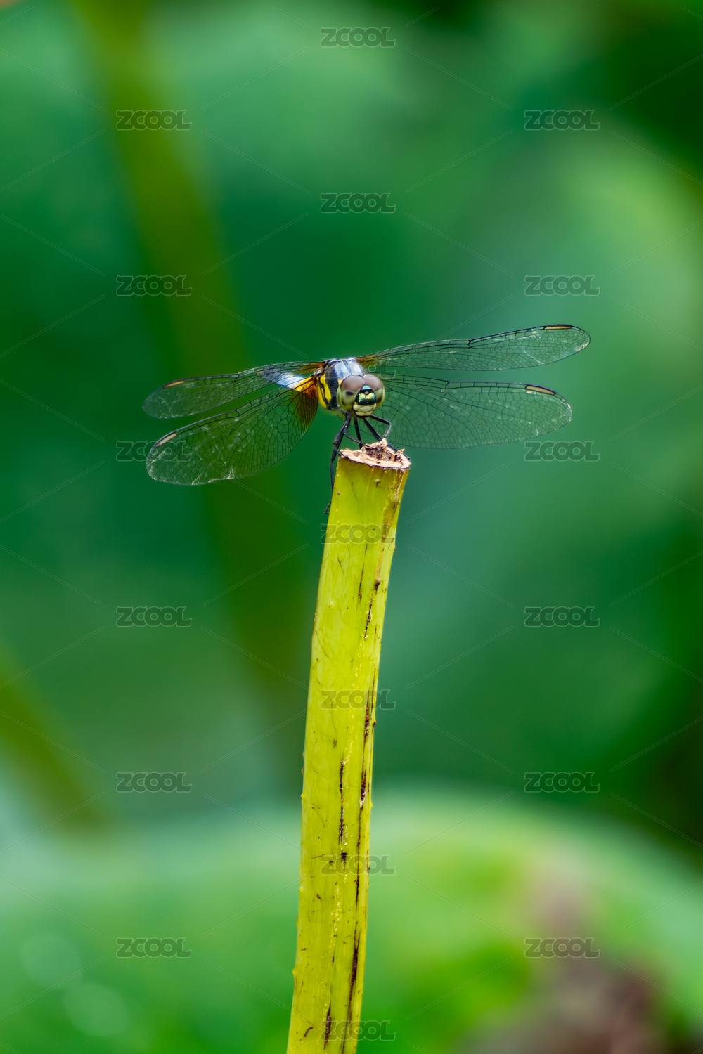 藍(lán)灰色的蜻蜓停留在荷塘麗荷葉桿上
