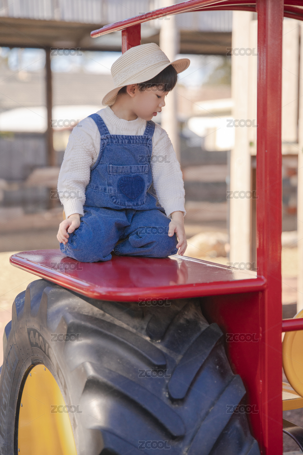紅色拖拉機(jī)上戴草帽的牛仔男孩