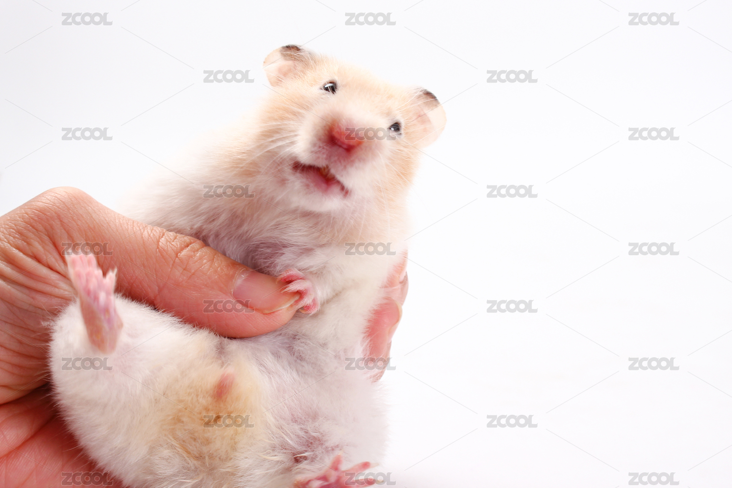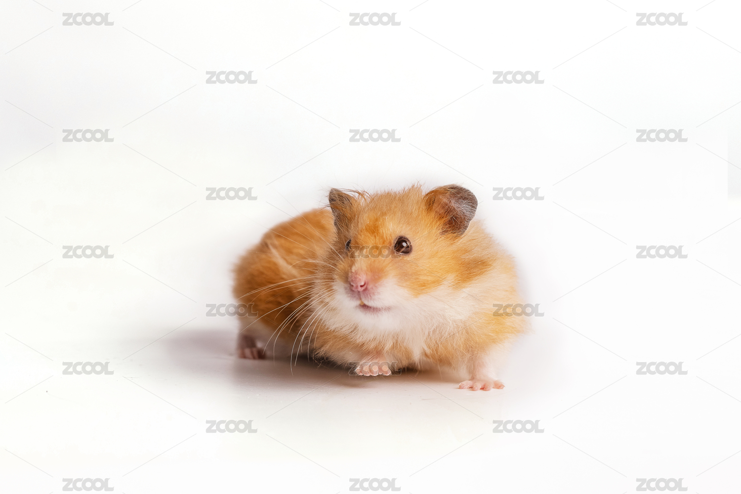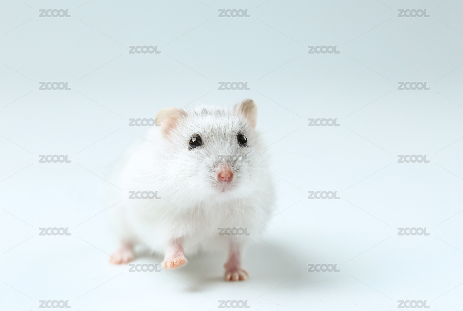 白色小倉(cāng)鼠抬起前爪邁步在白色背景前