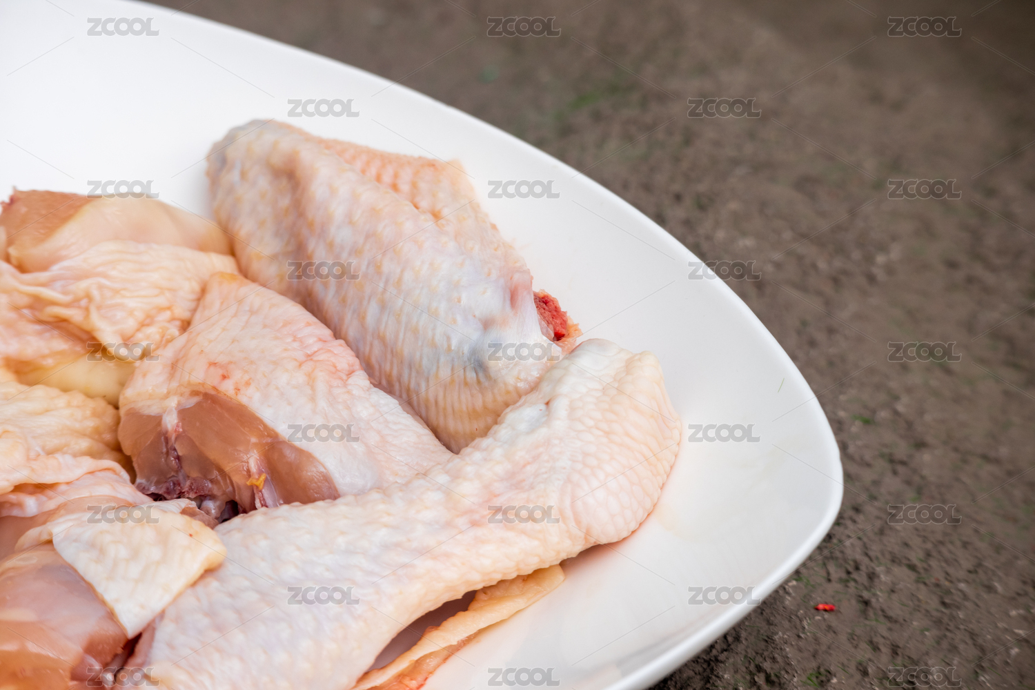 桌面上盤子里裝著新鮮的切塊雞肉食材