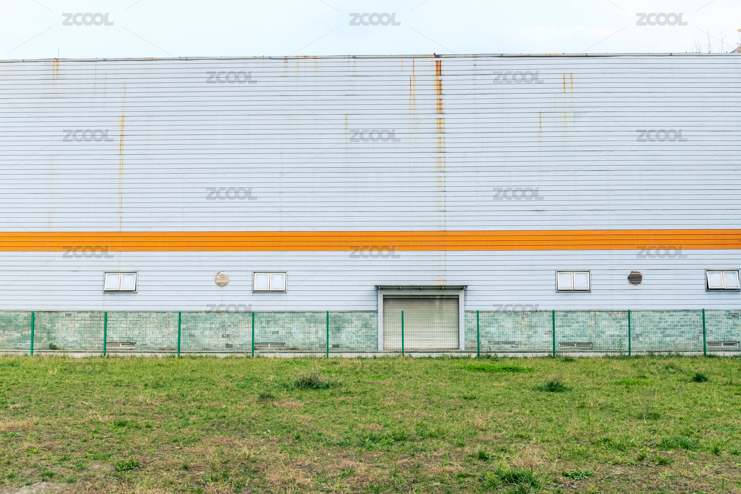 草地邊上的淺色鐵皮廠房建筑
