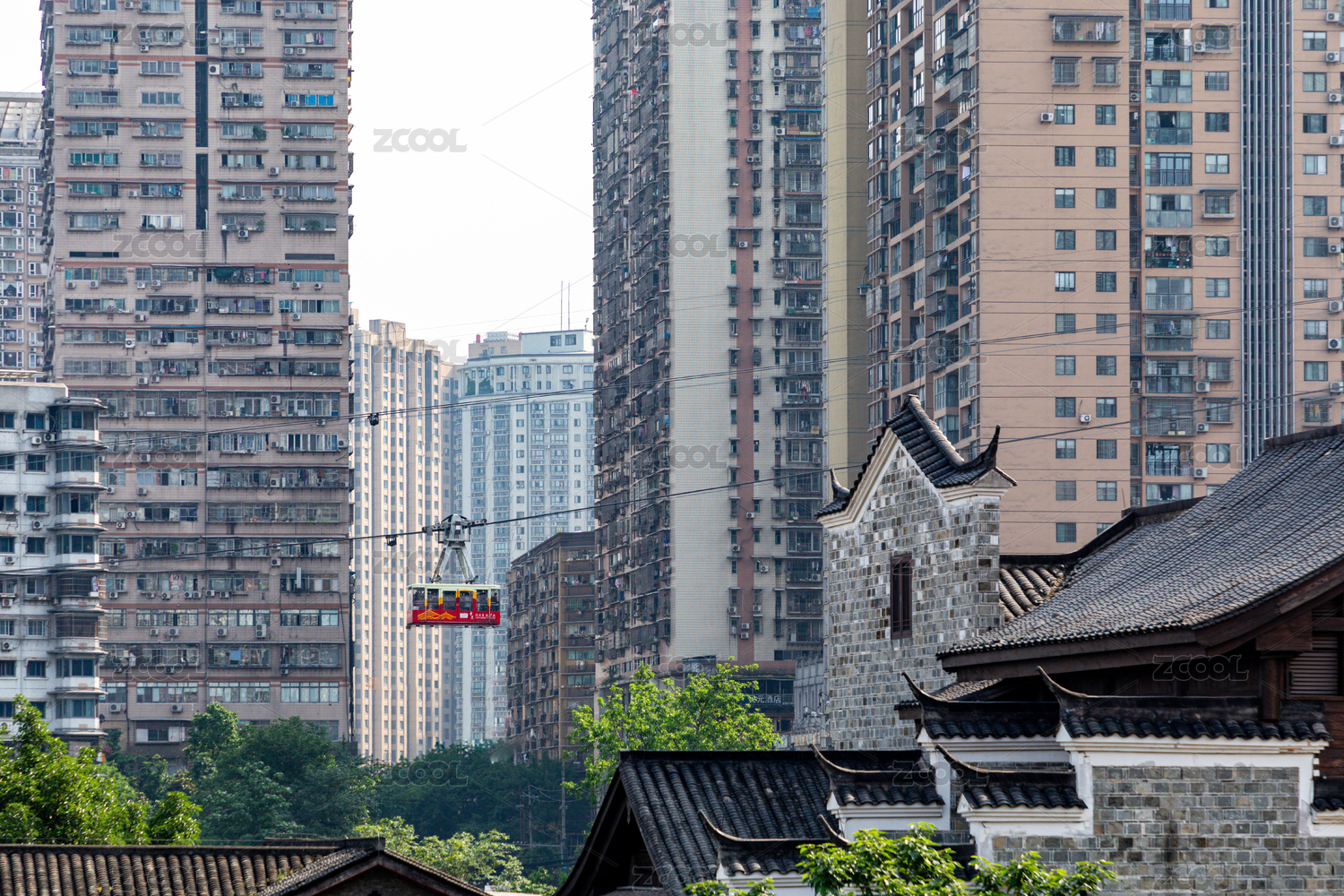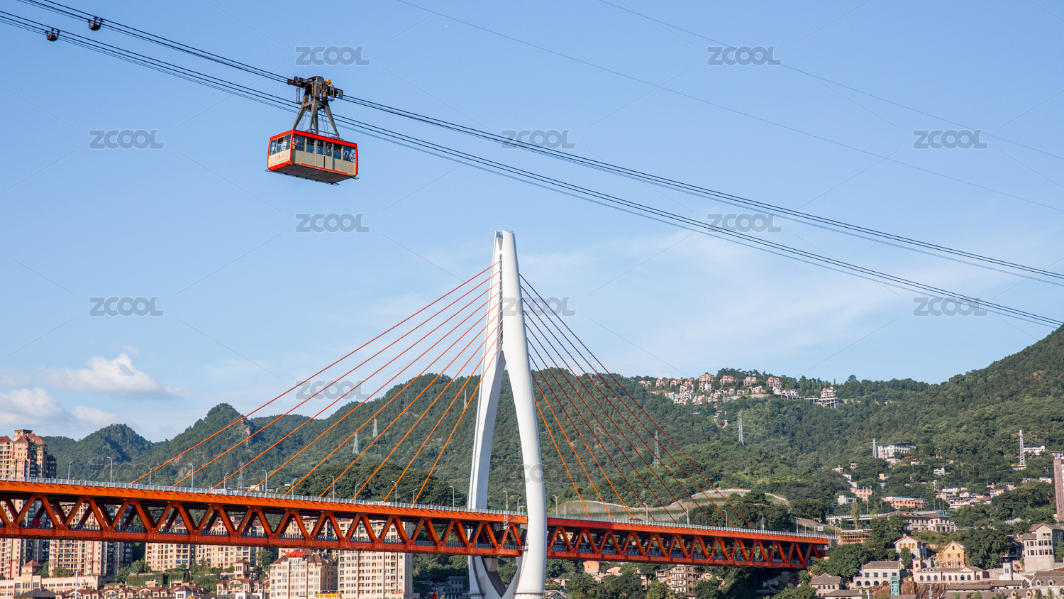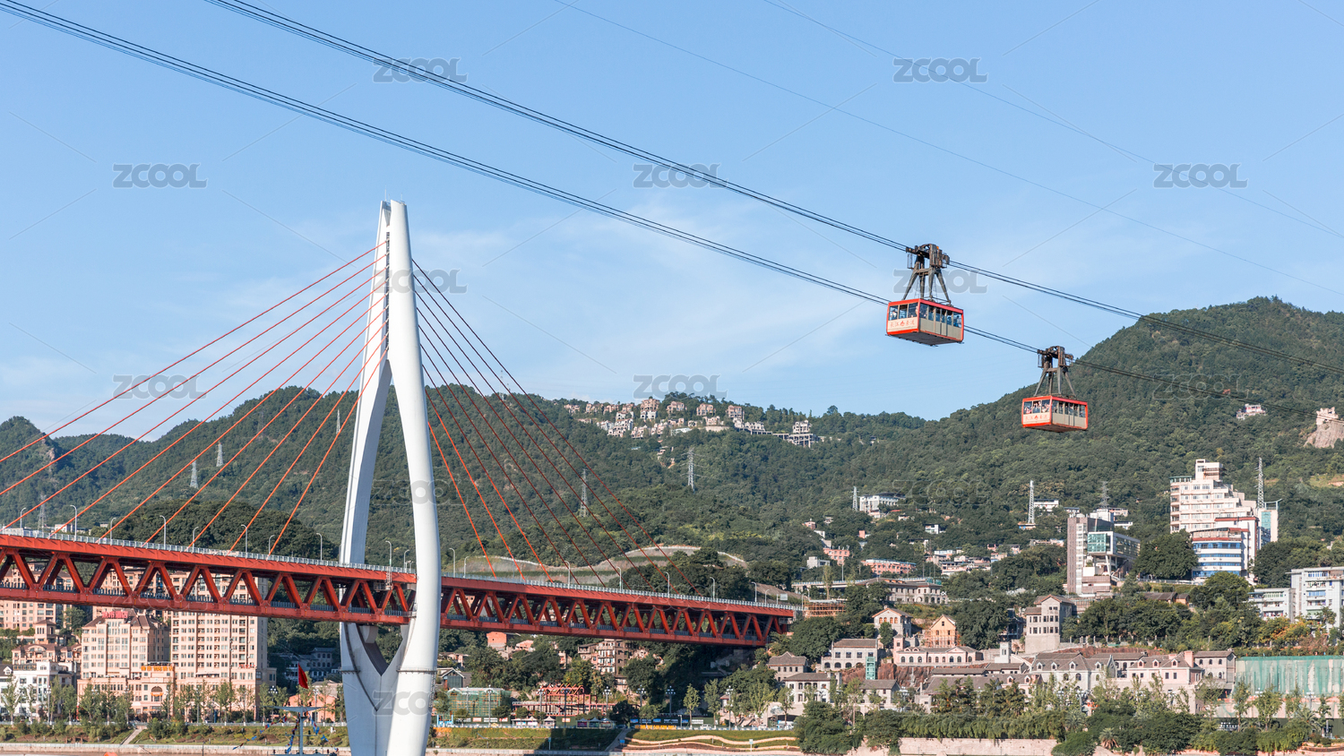 透過兩棟居民樓縫隙遠(yuǎn)眺重慶市長江索道纜車