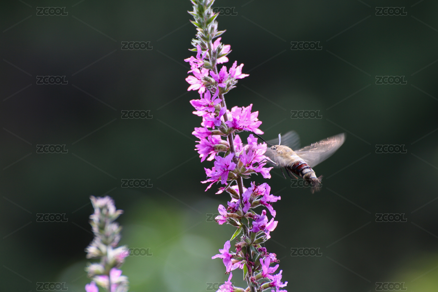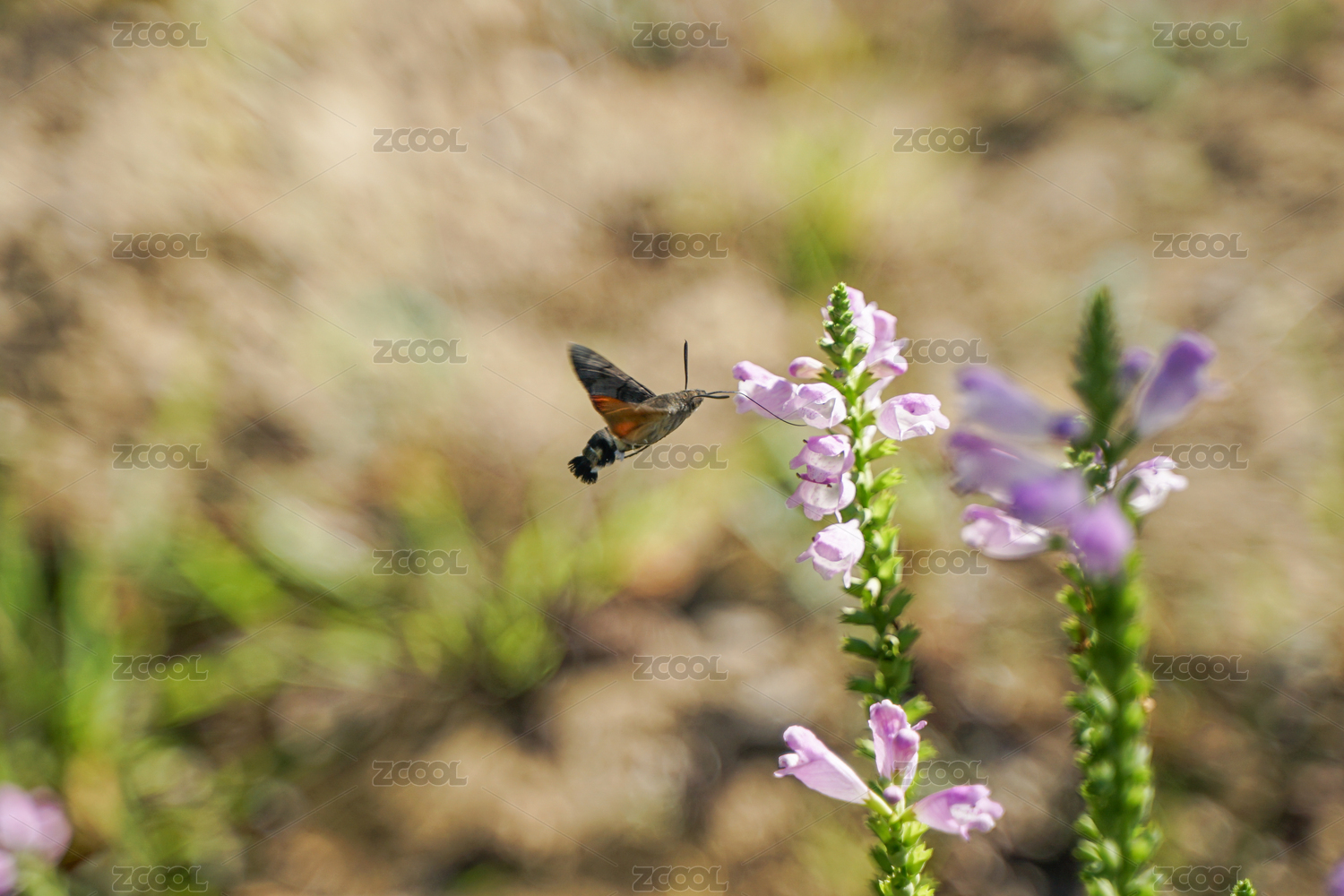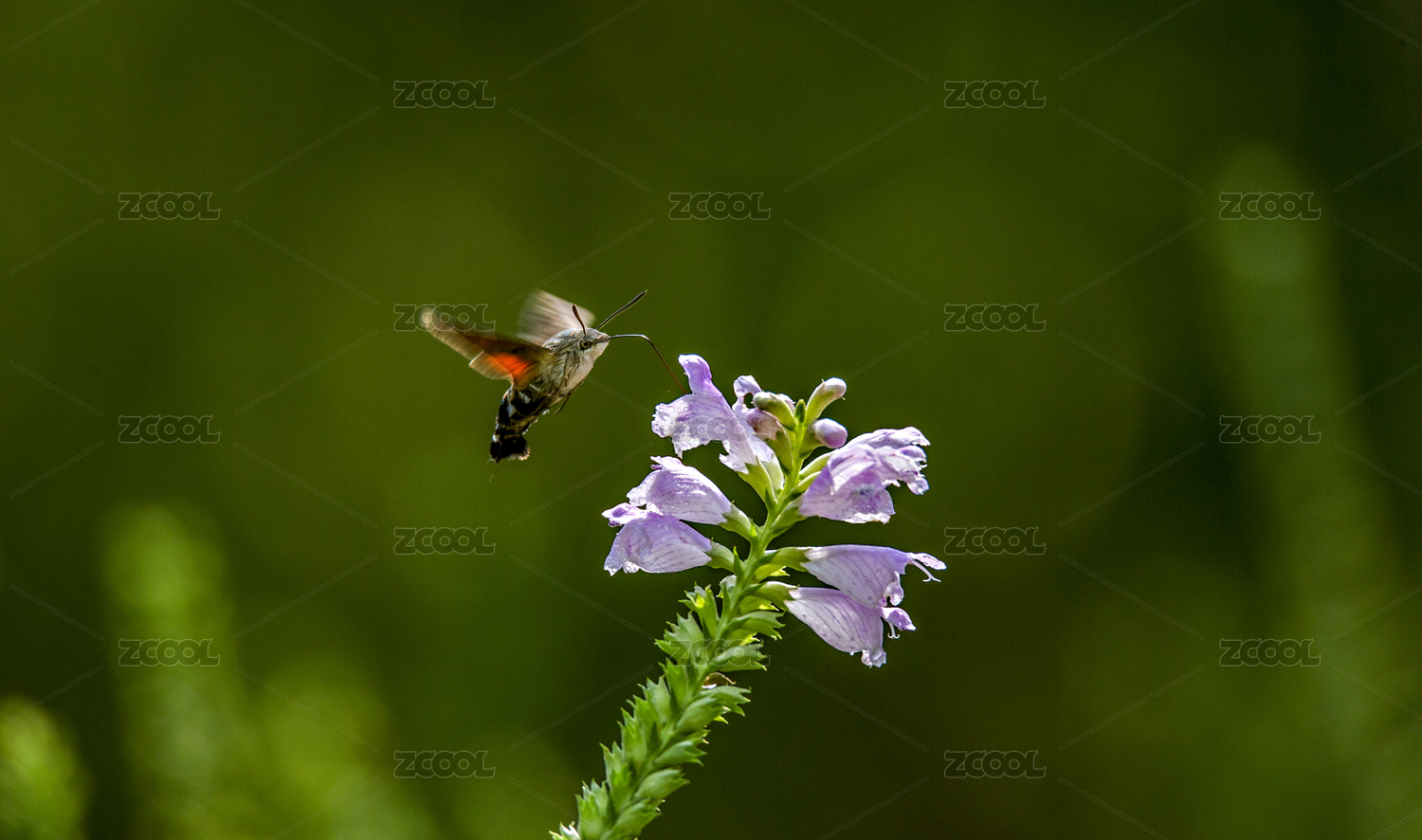 秋季戶外一只在假龍頭草花叢覓食的蜂鳥(niǎo)鷹蛾