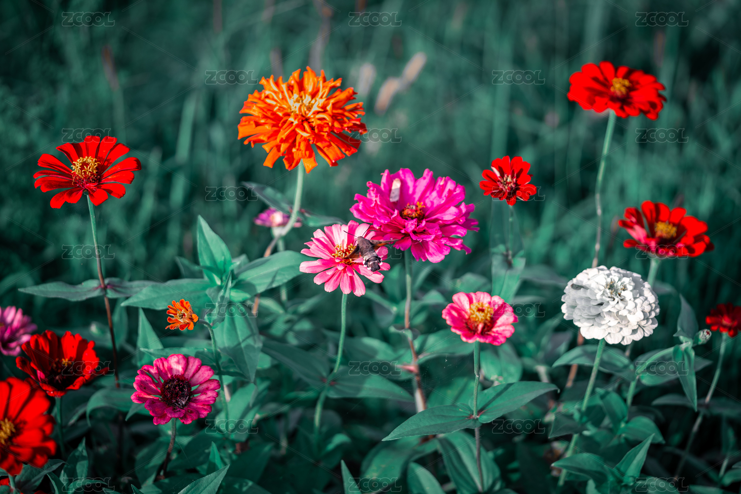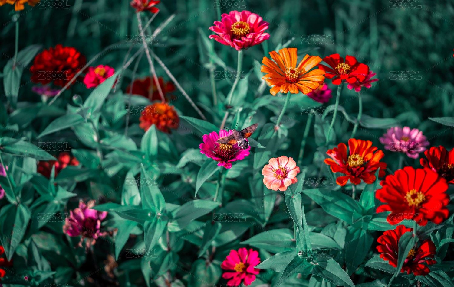 懸停在紫紅色百日菊花朵上采食花蜜的美麗蜂鳥(niǎo)鷹蛾