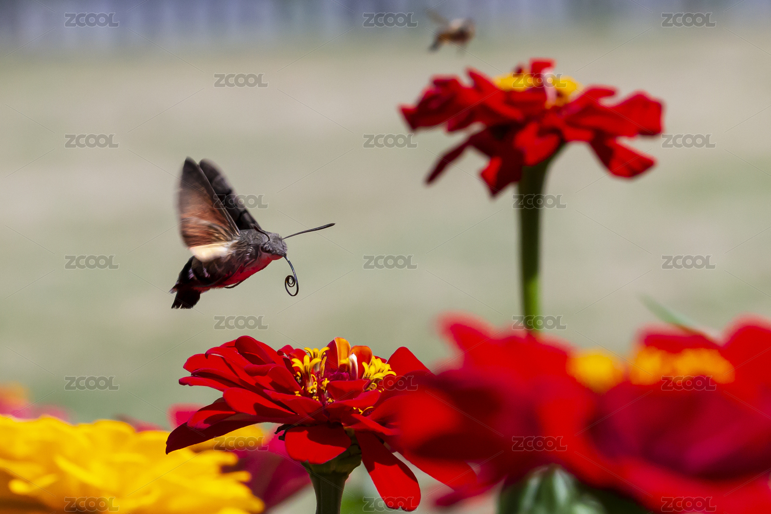 在紅色百日菊花朵上采食花蜜的美麗蜂鳥(niǎo)鷹蛾
