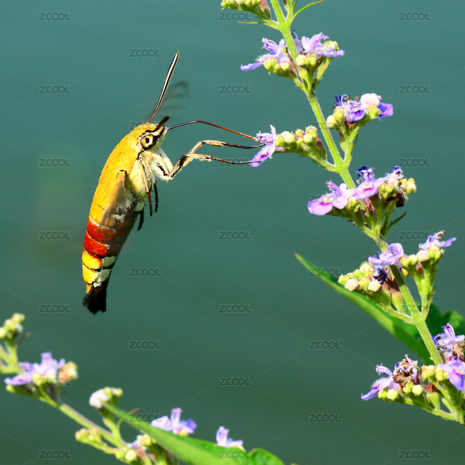 一只蜂鳥(niǎo)鷹蛾正懸停在花朵上采食花蜜