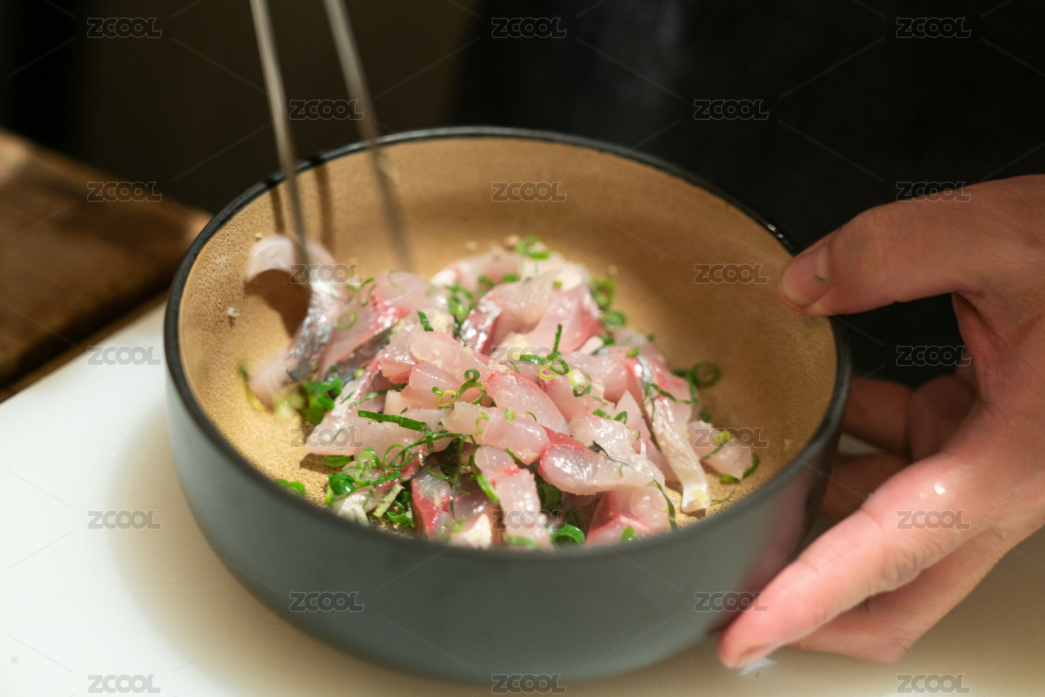 廚師正在攪拌一碗竹莢魚(yú)刺身