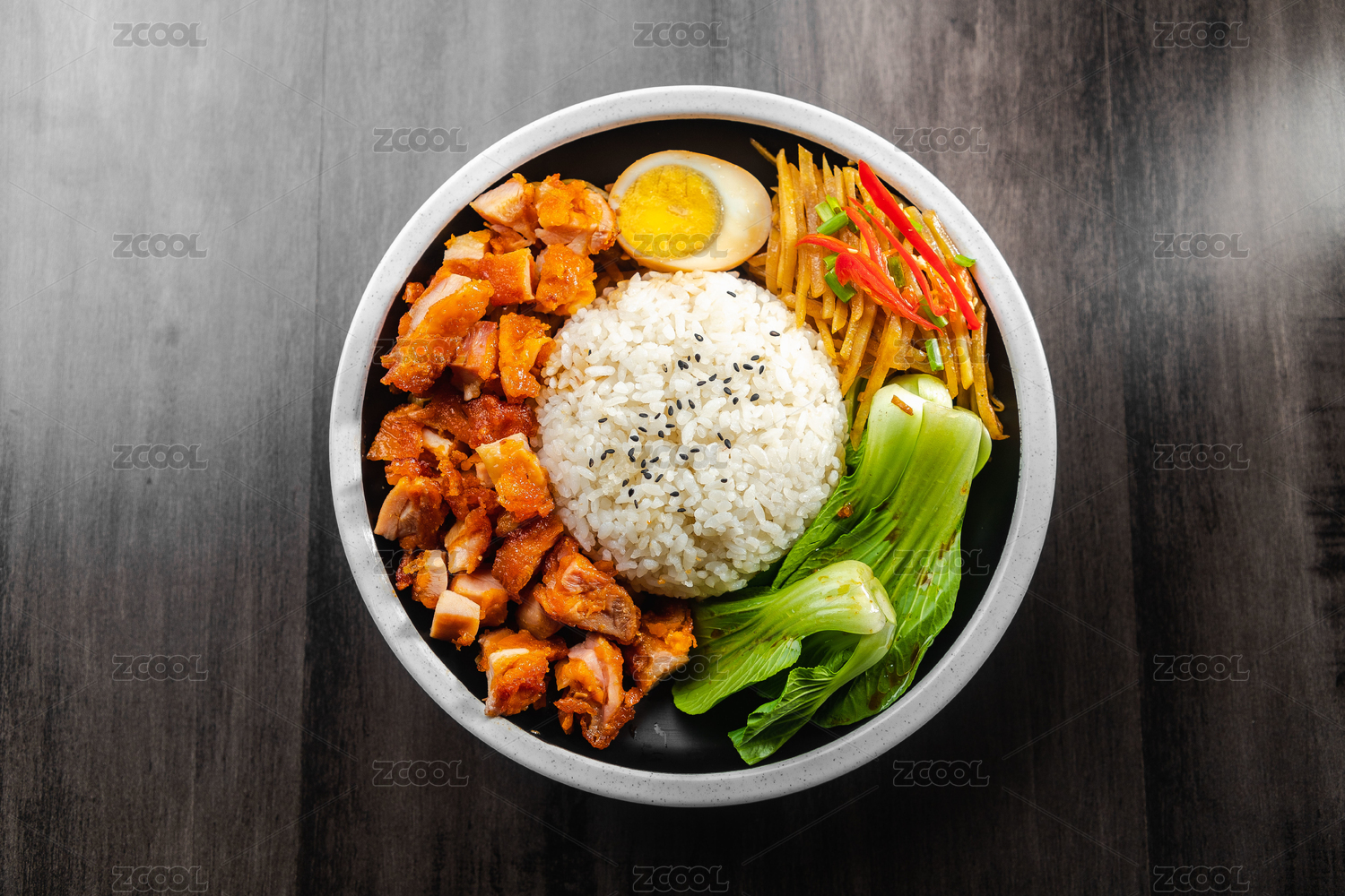 棕色木紋桌面上放著一碗砂鍋烤奧爾良雞腿肉拌飯