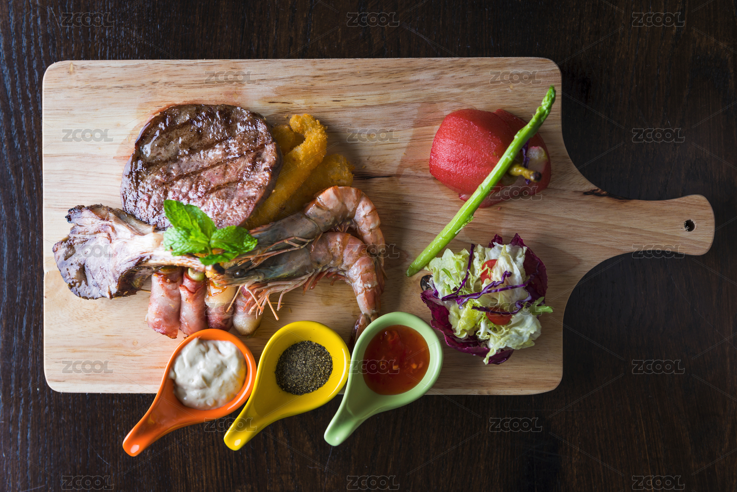 炭烤小羊排配烤大蝦及牛肉餅配蘆筍培根卷