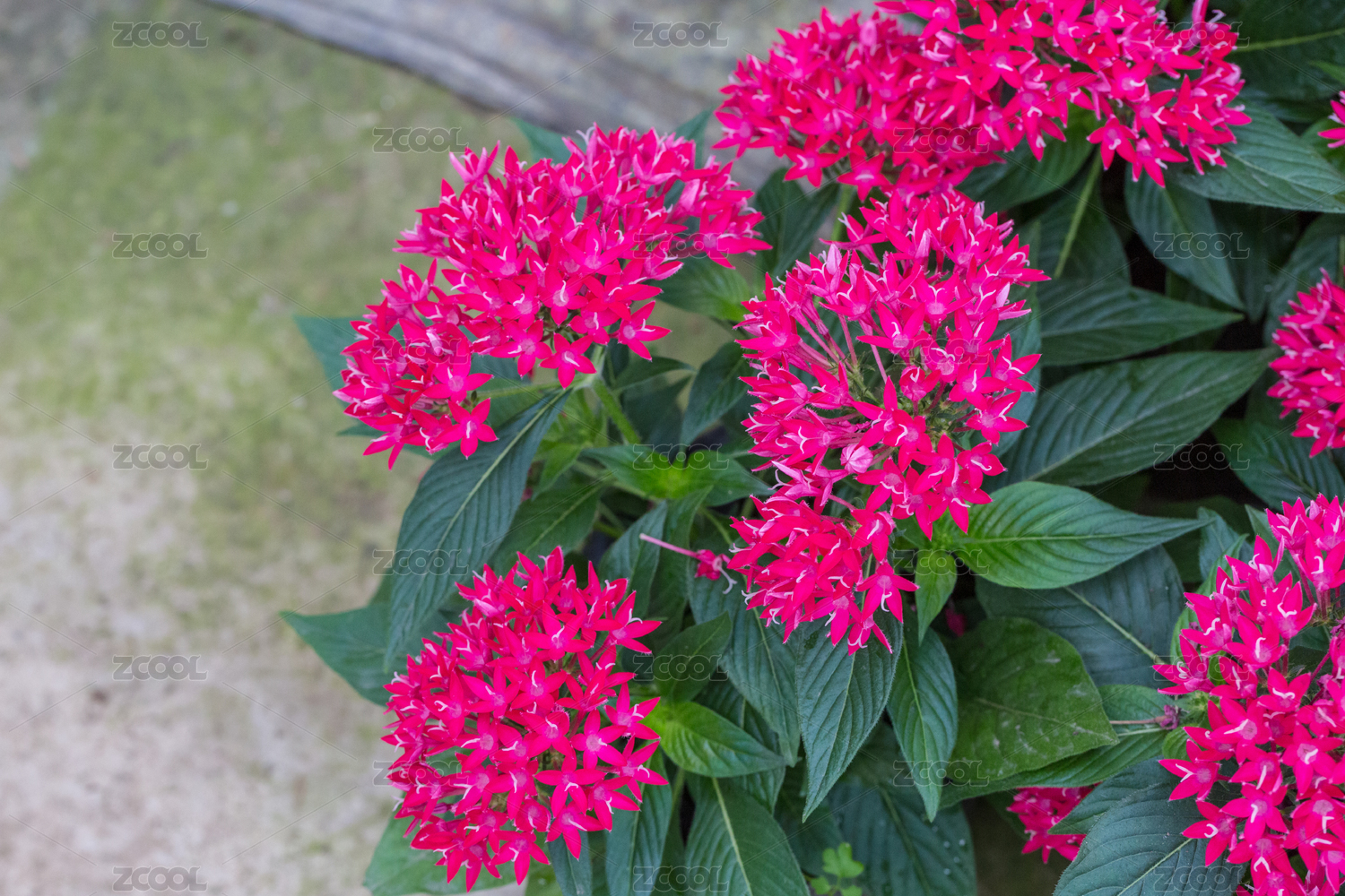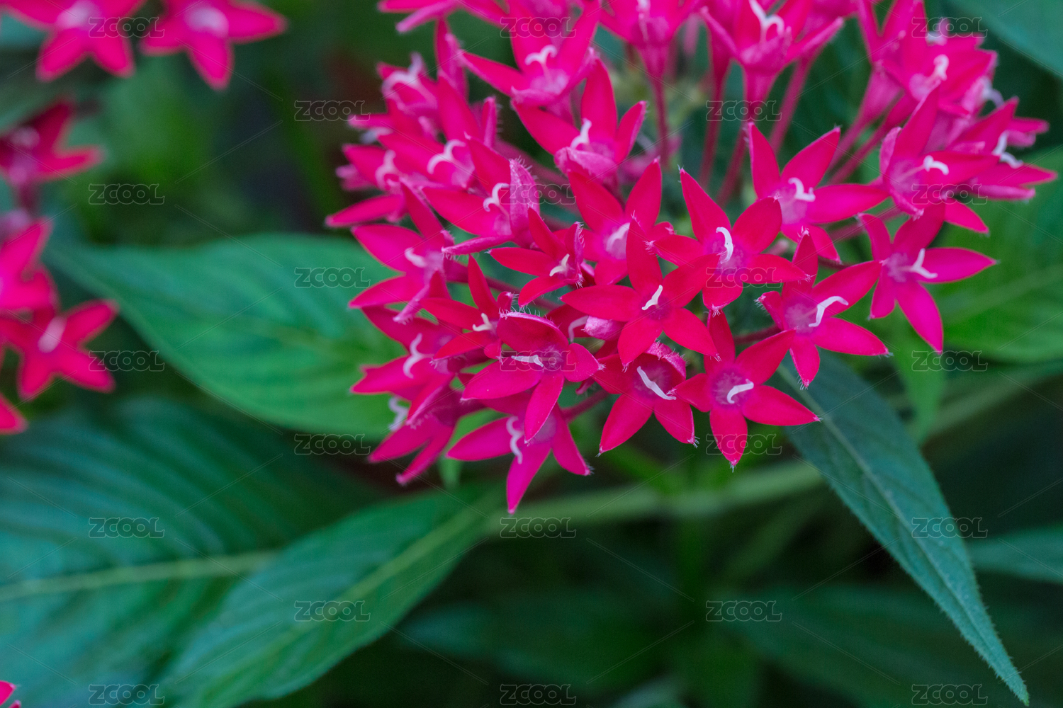 盛開的紅色五星花和綠色的葉子