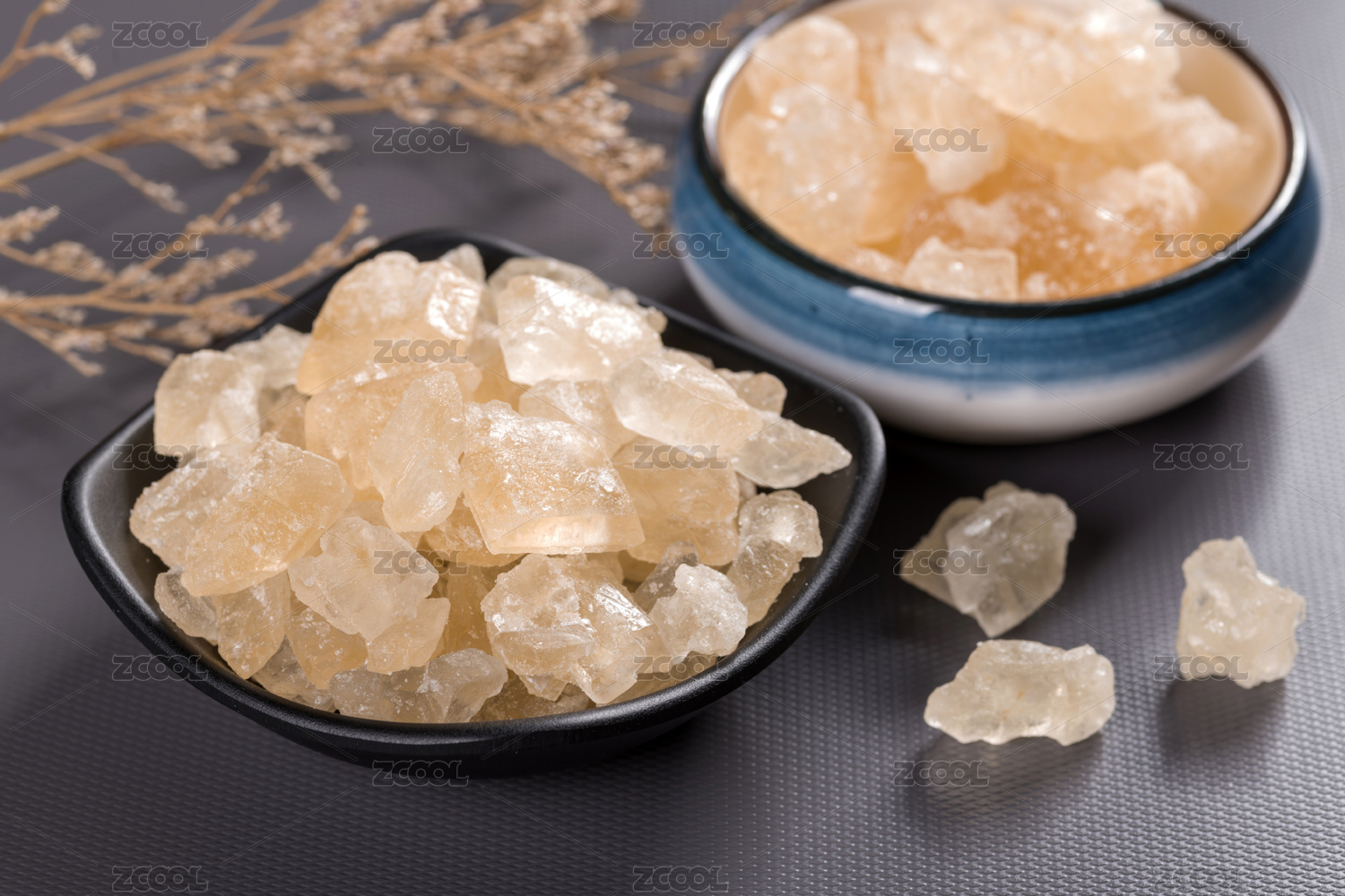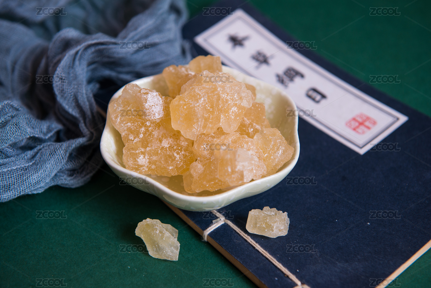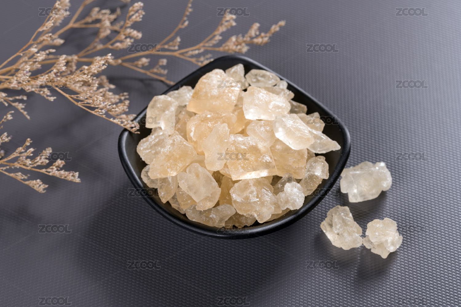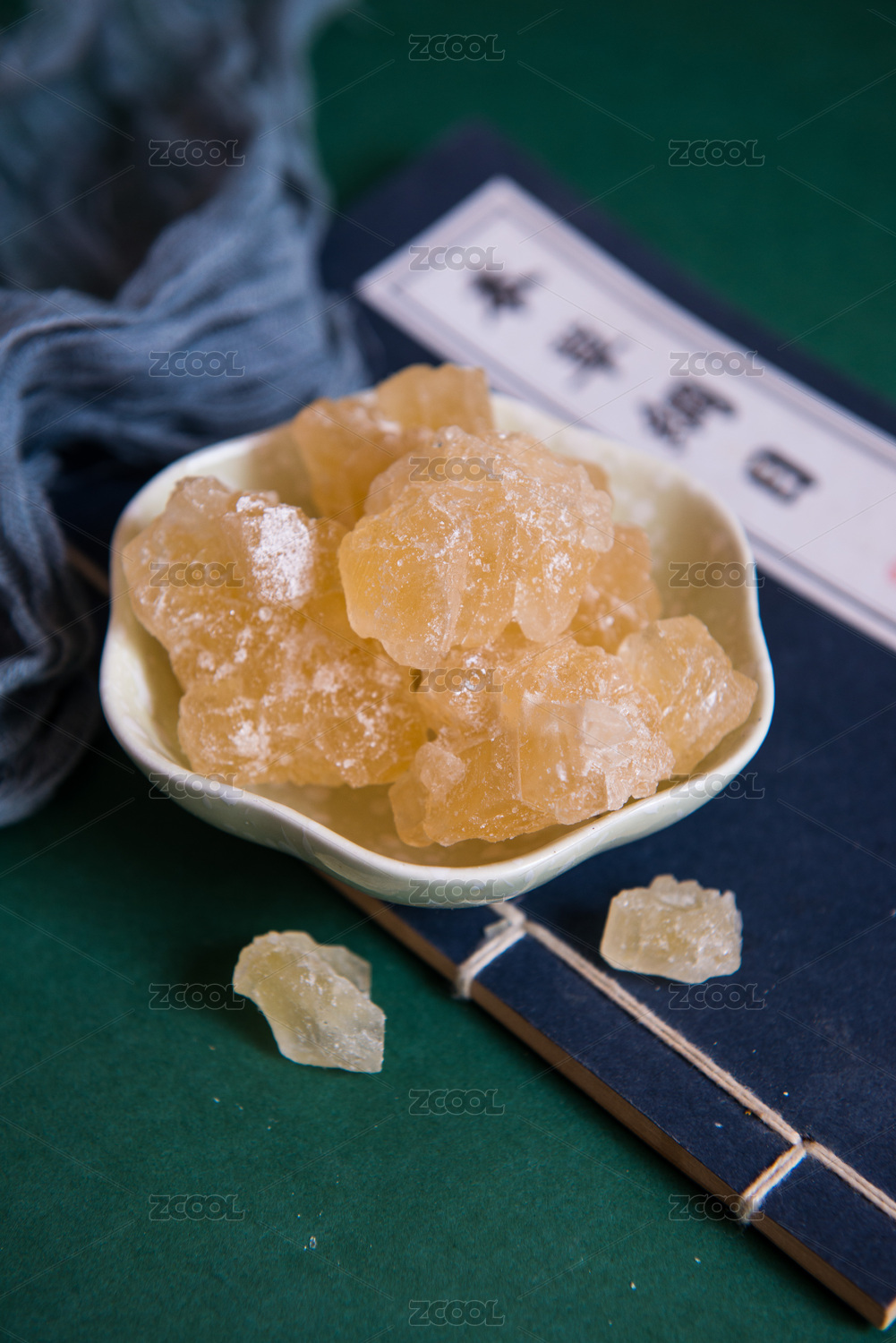 盛放在碟子中的黃冰糖擺放在桌面上