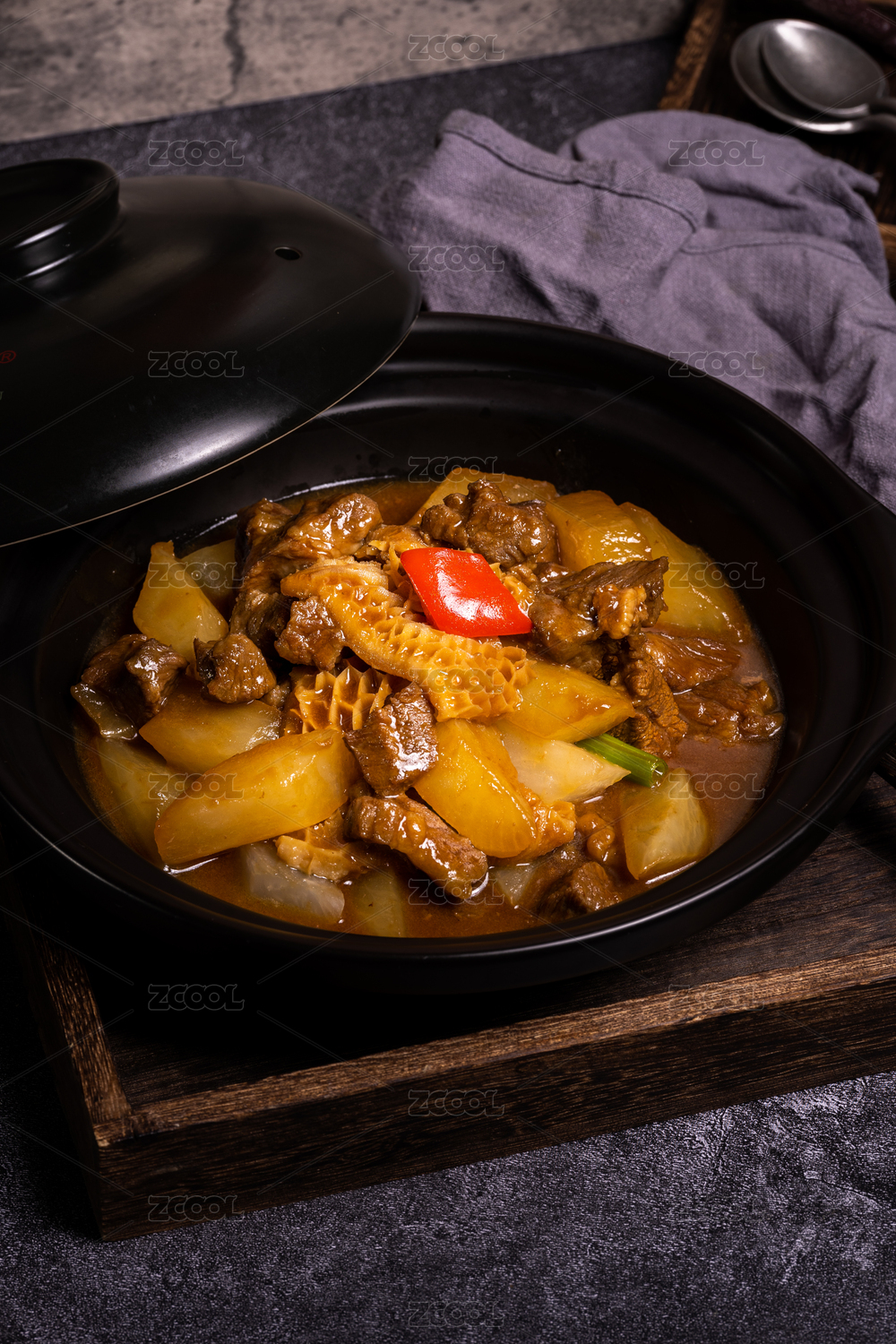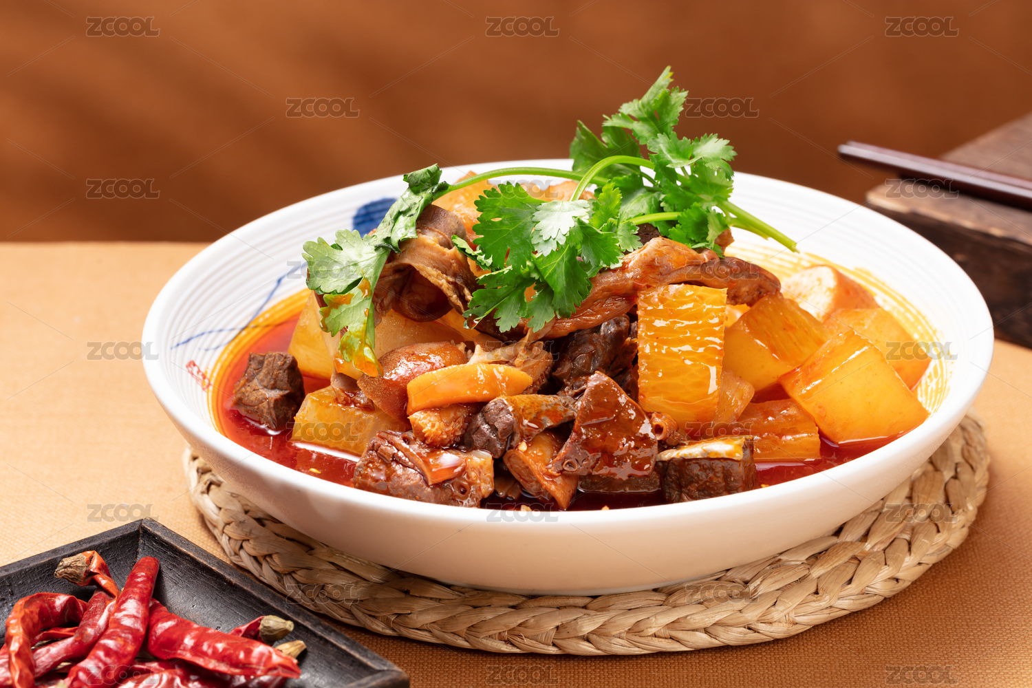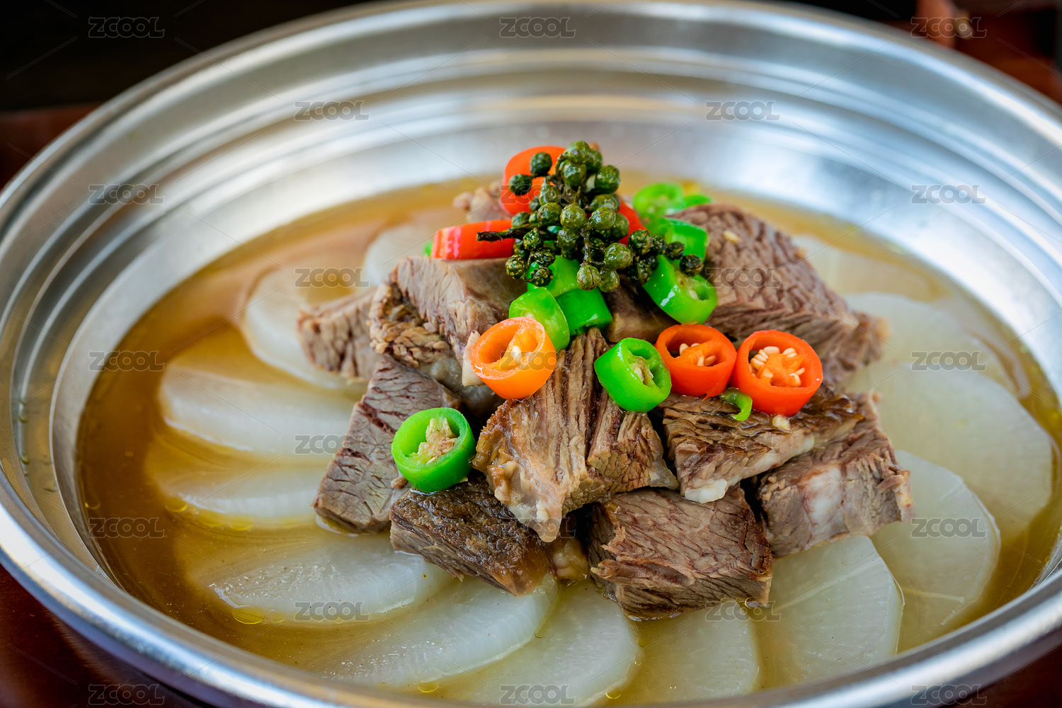 餐桌上碗里的辣椒牛腩燉蘿卜