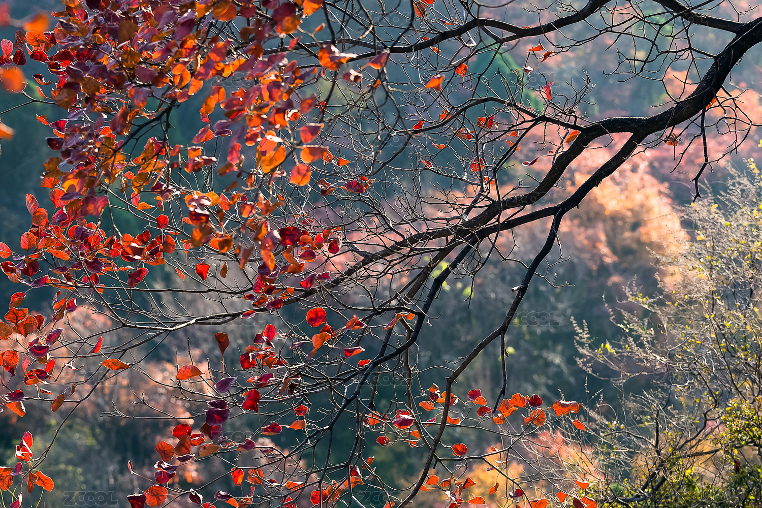 中國山東濰坊石門坊紅葉秋季山間多彩樹林