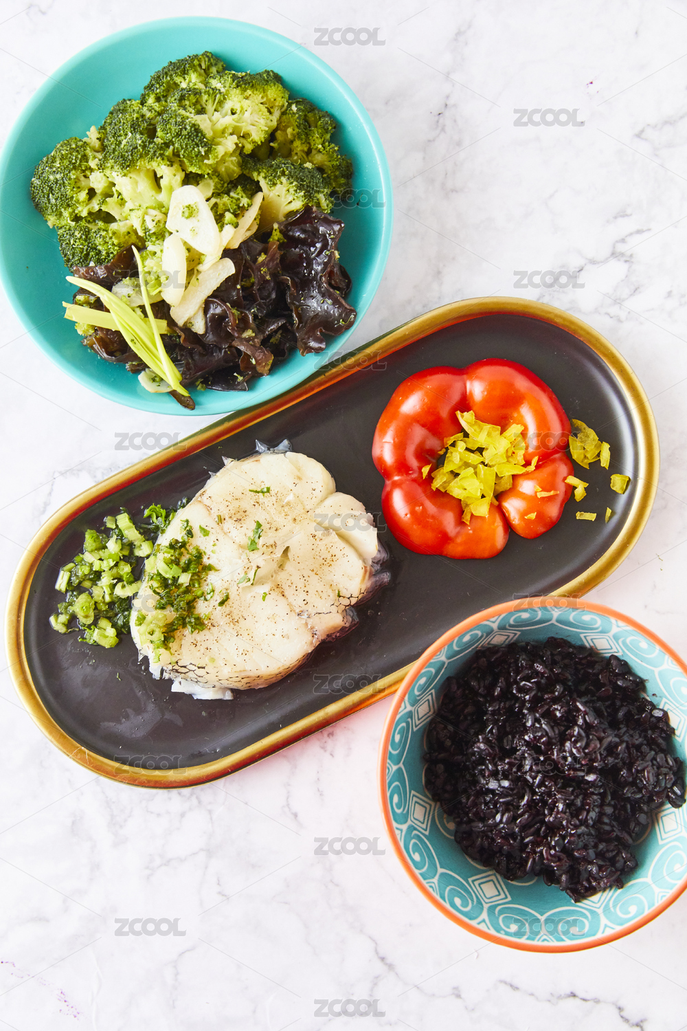 盤裝菜肴減肥低脂餐香煎龍利魚黑米飯拌涼菜