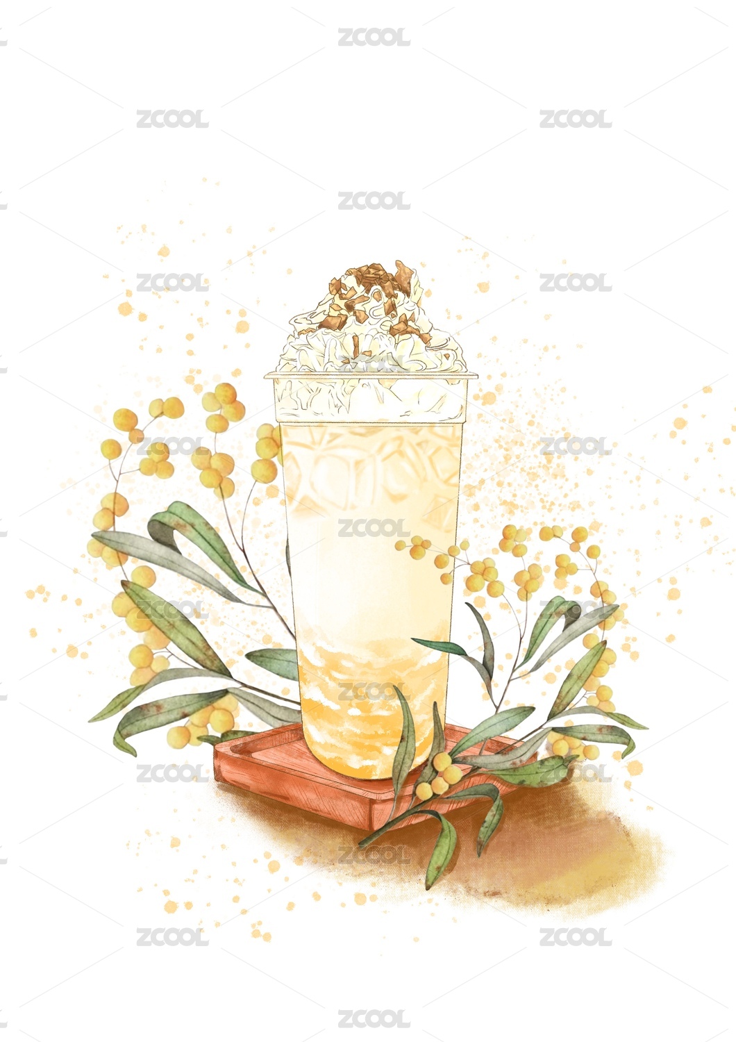桂花果凍奶茶水彩插畫